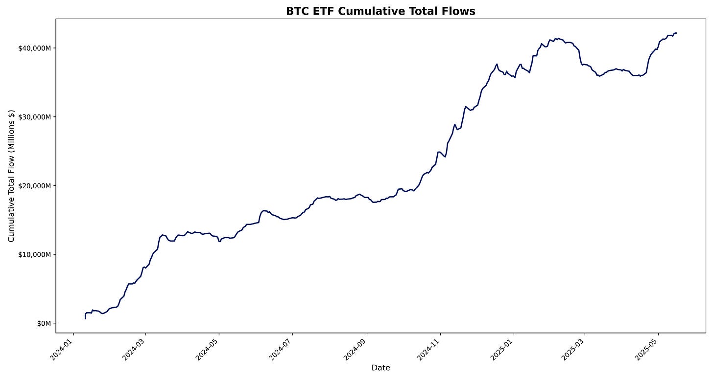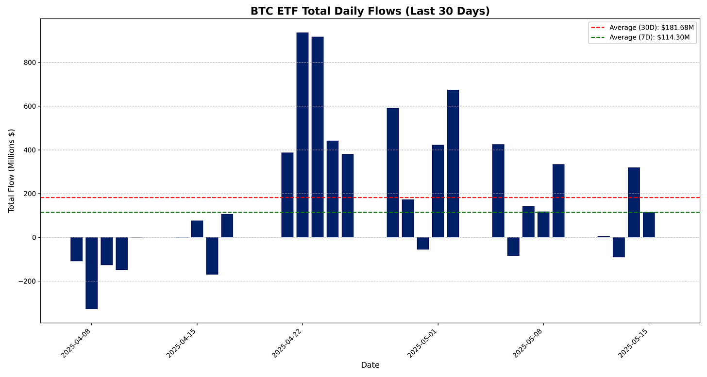 BTC ETFs total net daily flow for 15 May 2025 is +$114.9M.