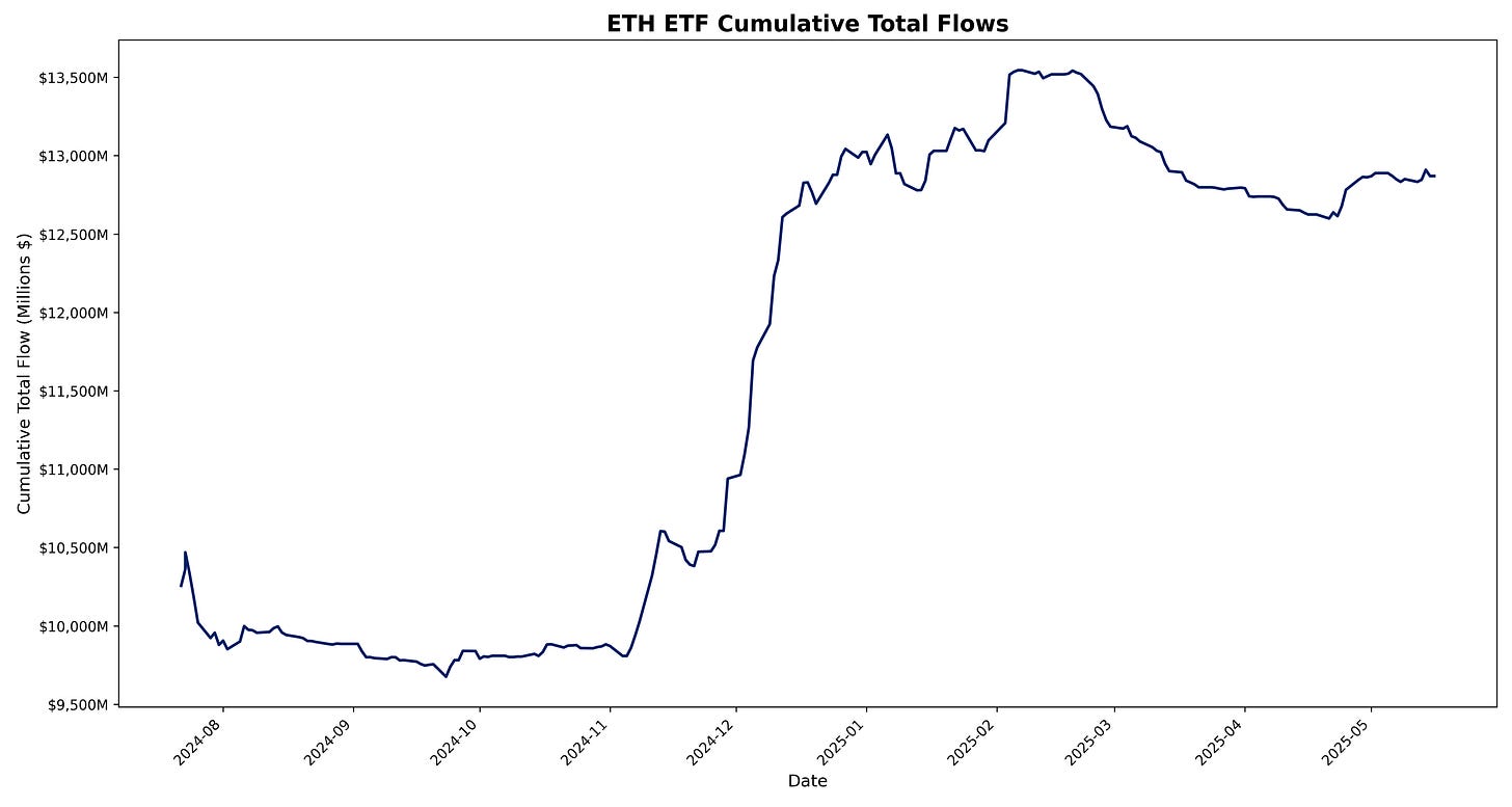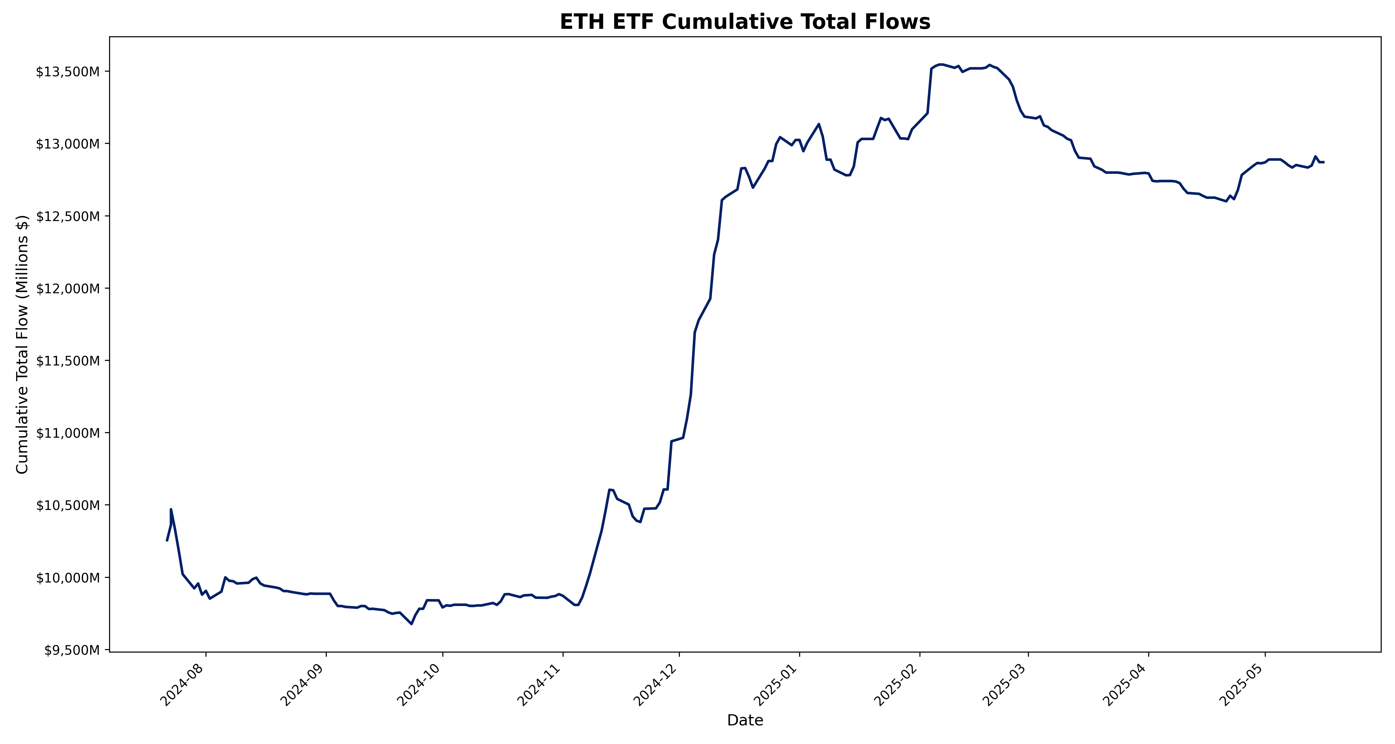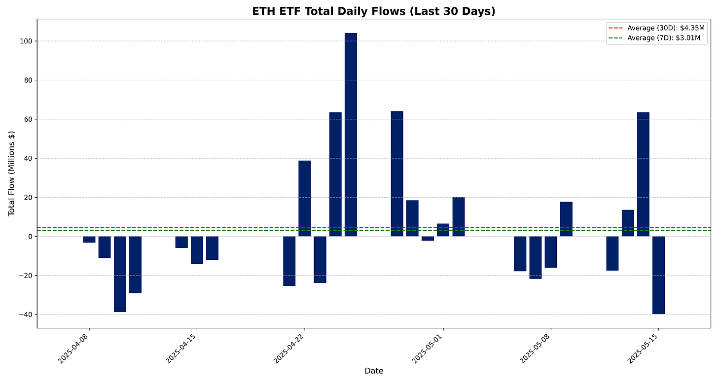 ETH ETFs total net daily flow for 15 May 2025 is –$39.8M.