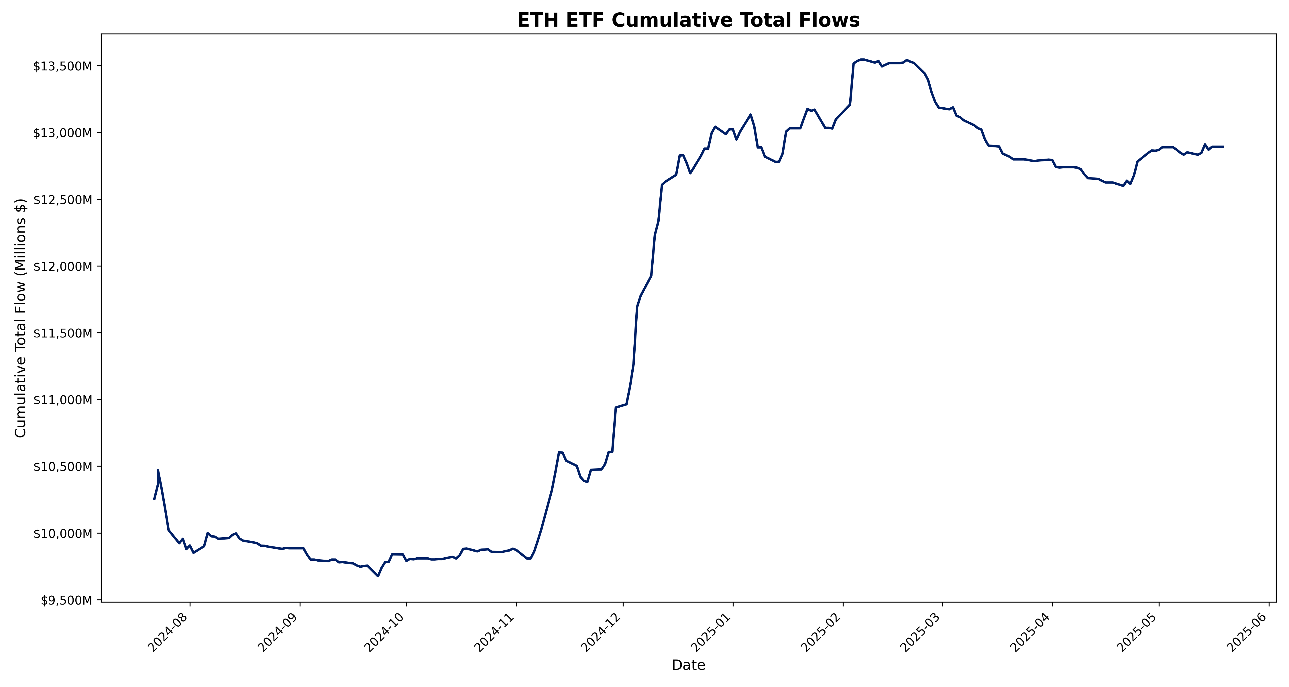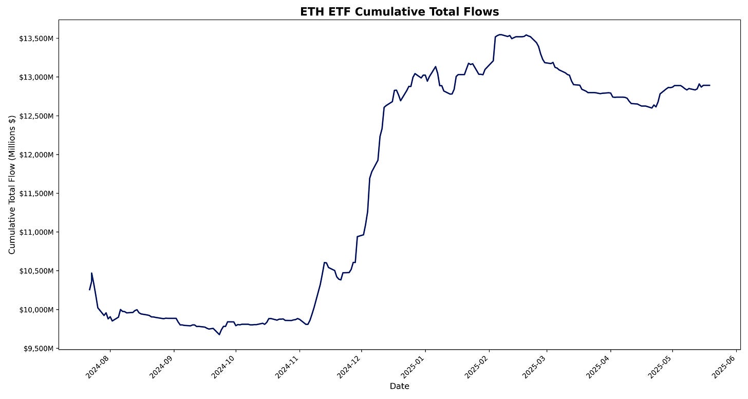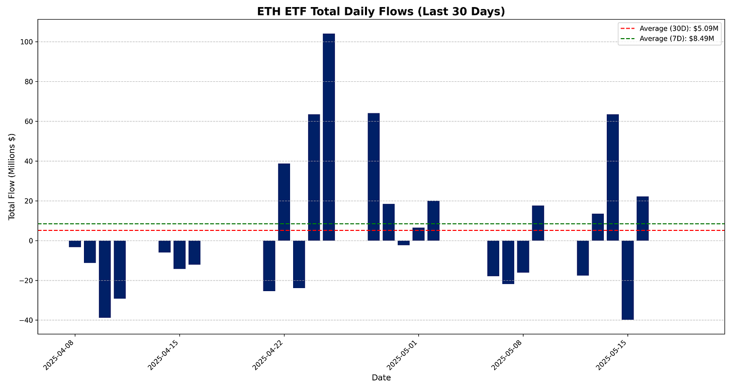 ETH ETFs total net daily flow for 16 May 2025 is +$22.2M.