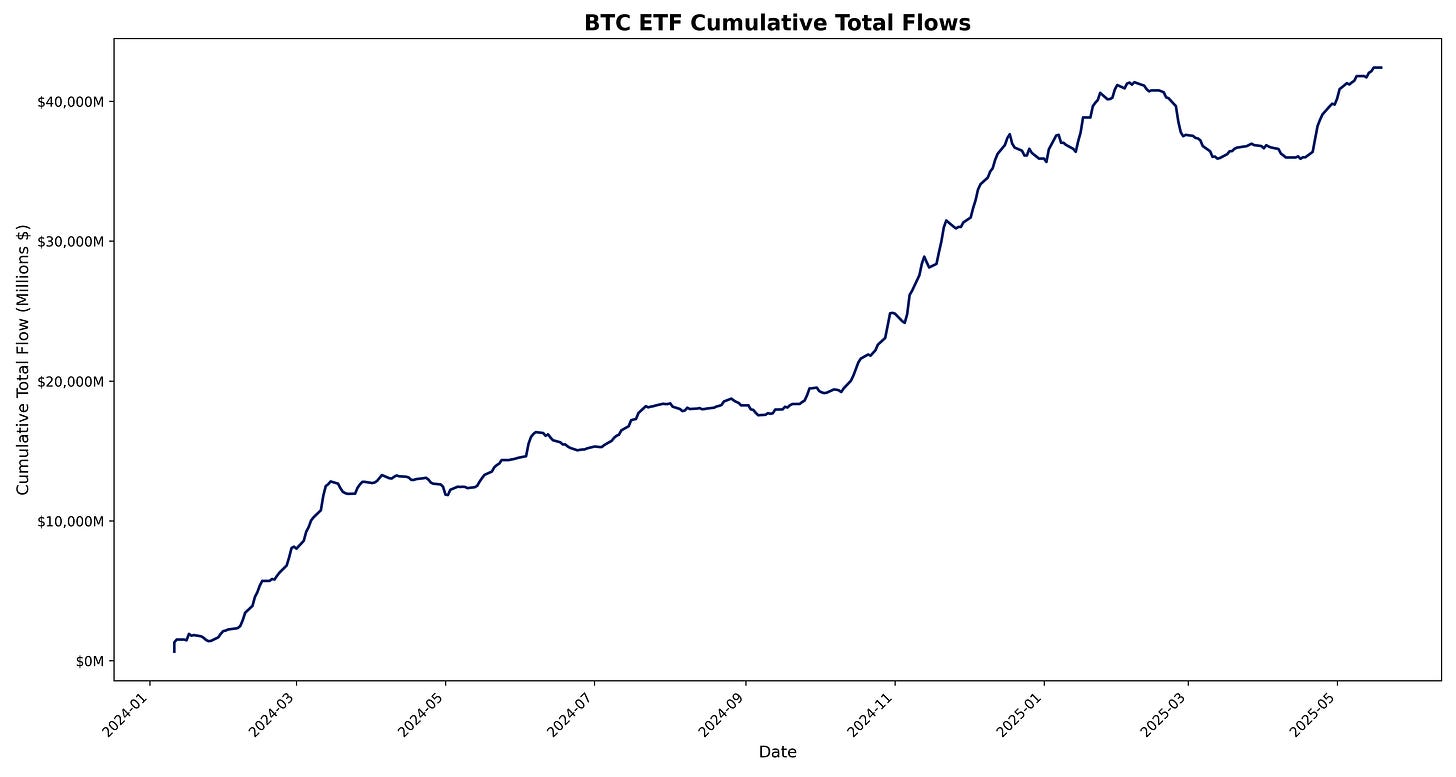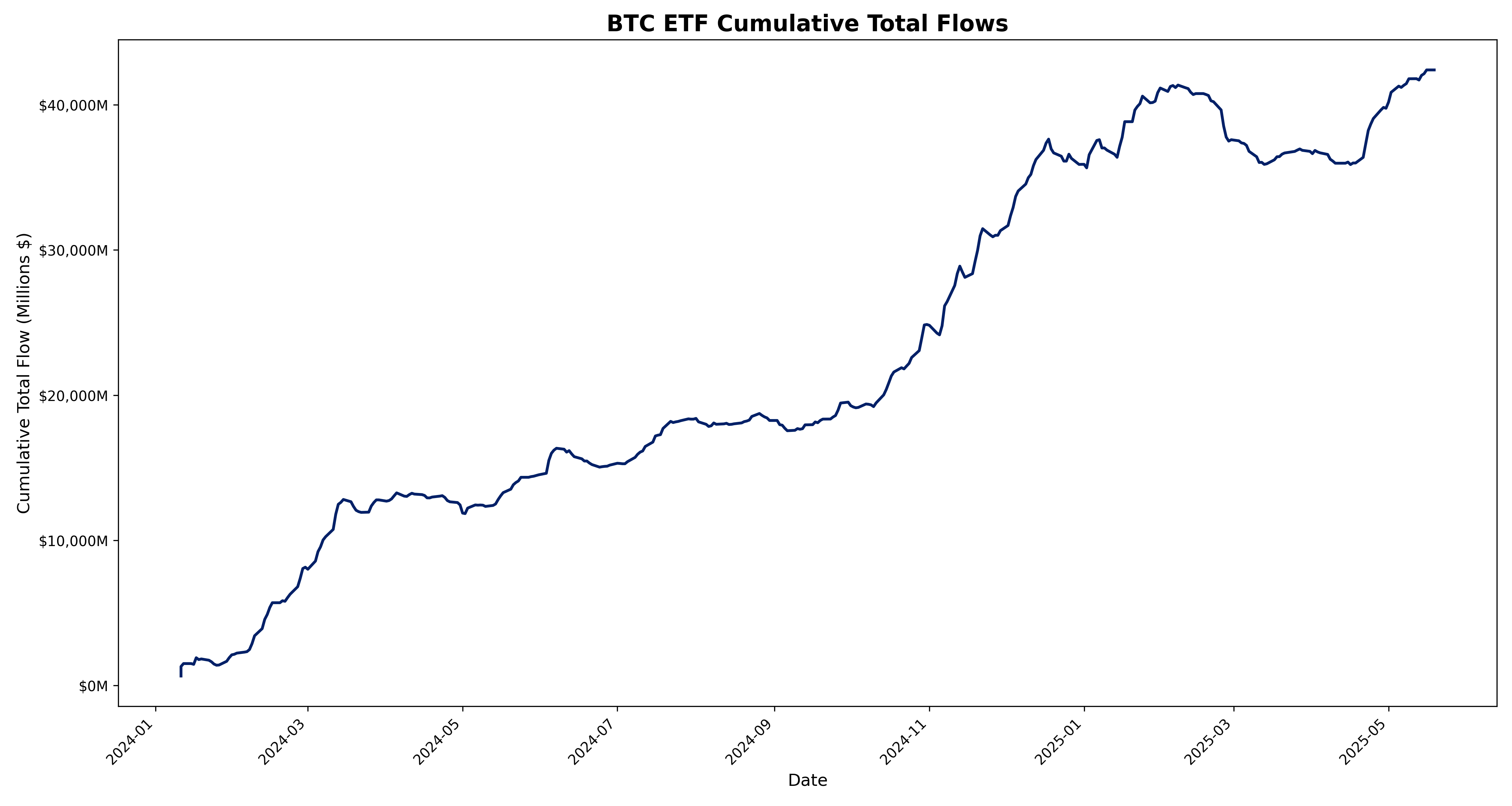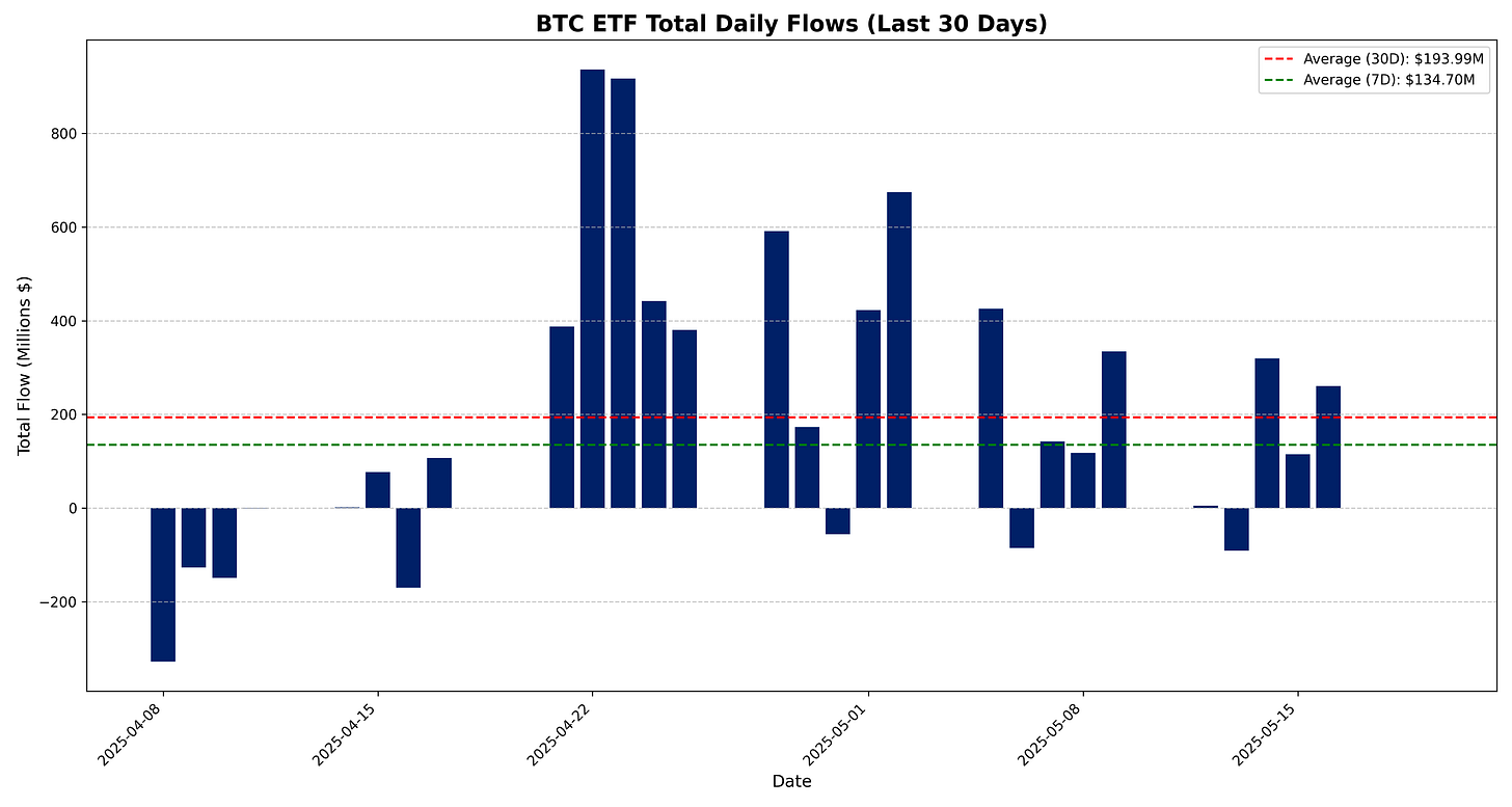 BTC ETFs total net daily flow for 16 May 2025 is +$260.2M.