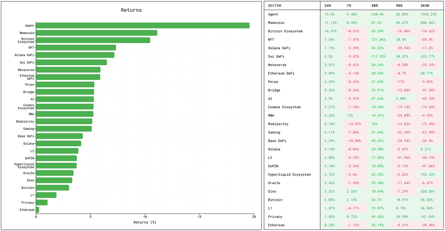Agent sector is up 19.60% over the last 24 hours, topping the leaderboard (VIRTUAL up 20.28%, GRIFF up 21.63%, AIXBT up 13.23%).