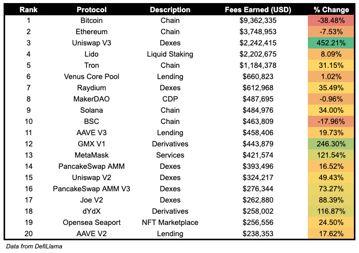 Uniswap V3 fees earned are up 452.21% today, GMX V1 fees earned are up 246.30%