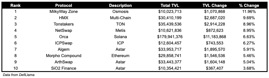 MilkyWay Zone, liquid staking for Celestia, TVL is up 11.96%.