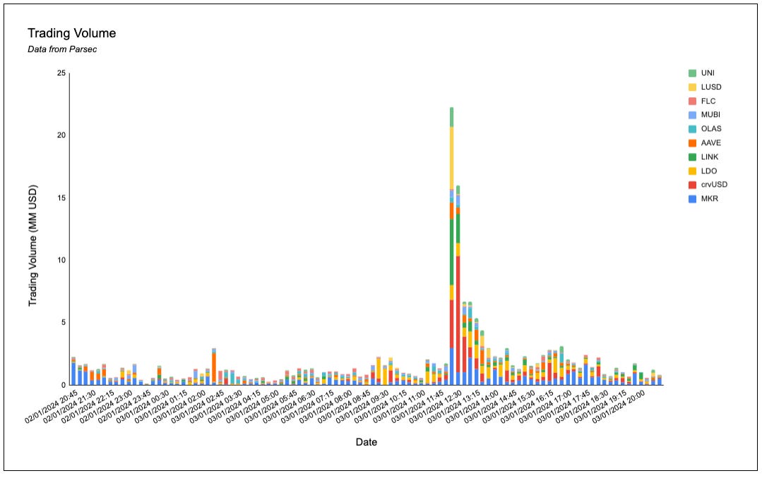 MKR, crvUSD, LDO, LINK and AAVE dominated on-chain volumes.