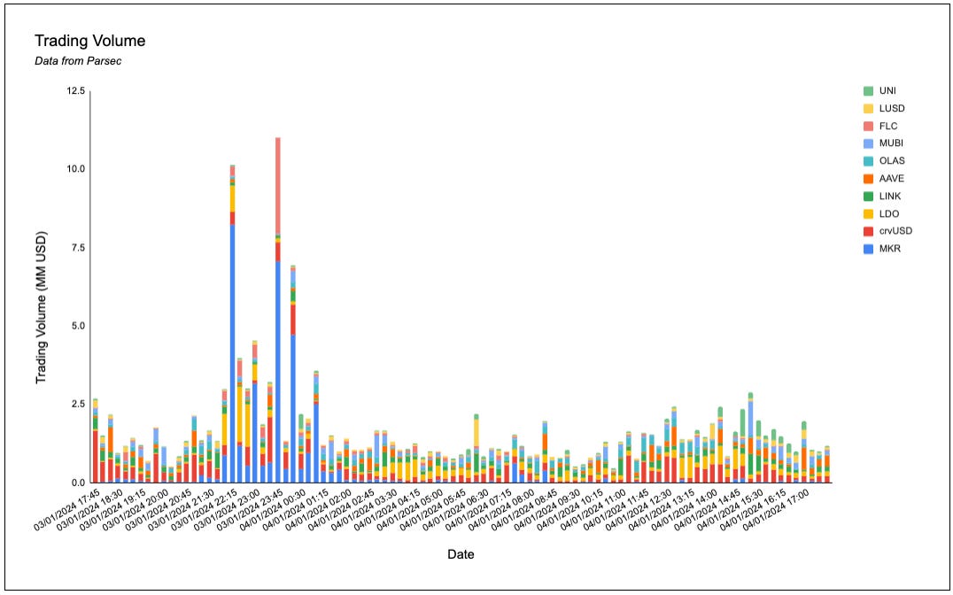 MKR, FLC and LUSD dominated onchain volumes today.