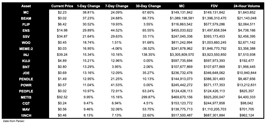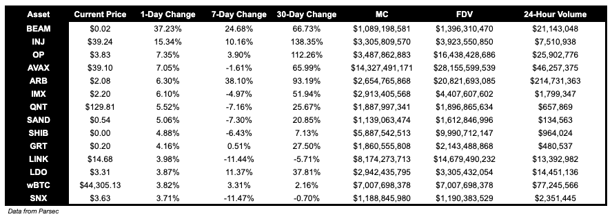 INJ had a great day and is up 15.34%. OP is up 7.35%, ARB is up 6.30% and AVAX is up 7.05%.