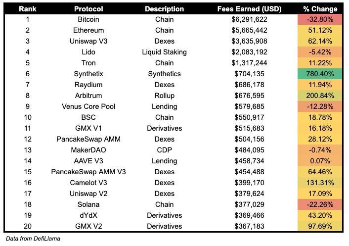 Synthetix fees earned are up 780.40%, following the large liquidation event yesterday. Arbitrum fees earned are up 200.84% and Camelot V3 fees earned are up 131.31%.