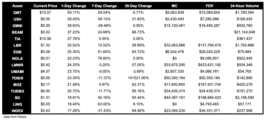 DMT, SankoGameCorp, is up 83.11% over the past day. Notably, Sanko announced that they are building an L3 a few months ago and Arbitrum announced today that users will be able to use ERC-20 tokens for gas and transaction fees on L3s. USH is up 59.45% today.
