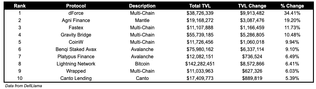 Agni Finance, DEX on Mantle, TVL grew by 19.20%.