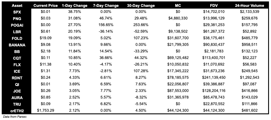 SPX, up 38.75%, performed well today. LBR, up 20.19%, and BANANA, up 13.91%, similarly performed well.