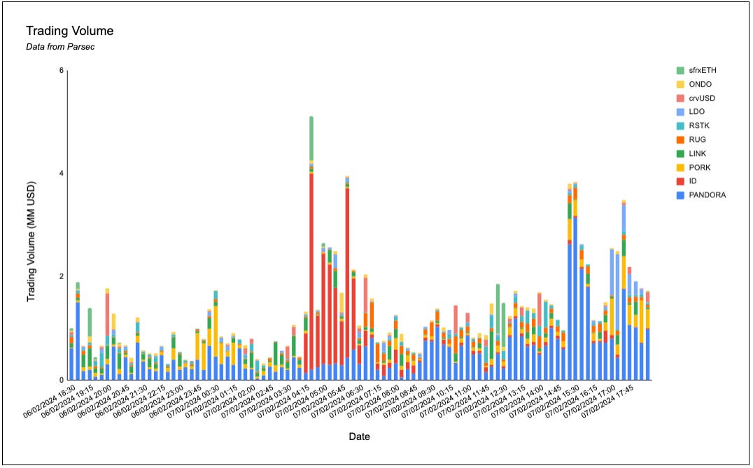 PANDORA, ID, PORK, LINK, RUG AND LDO dominated on-chain volumes.