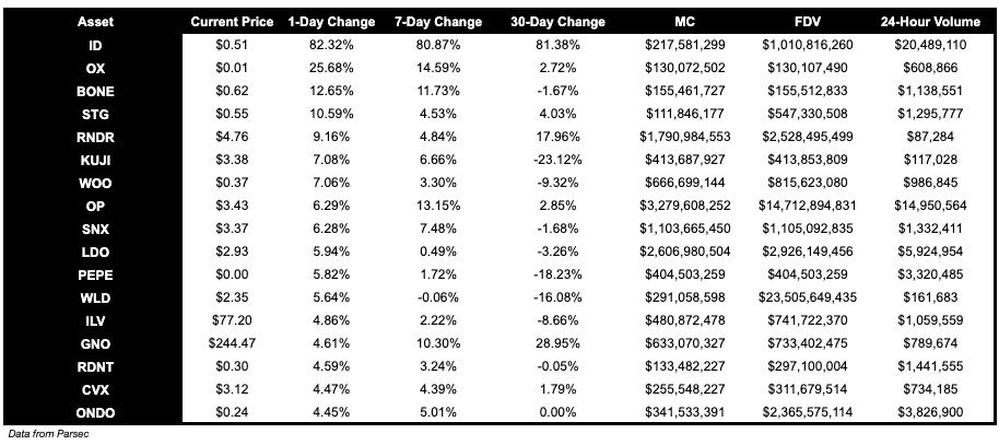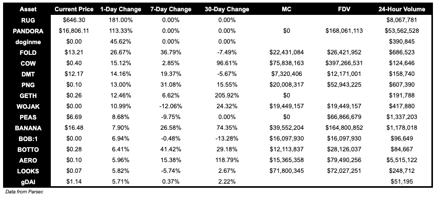 PANDORA had a good day, again, and is up 113.33%. doginme, a memecoin related to Farcaster, is up 45.62%.