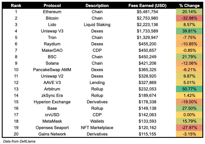 Arbitrum fees earned are up 50.77% and Base fees earned are up 27.5%.