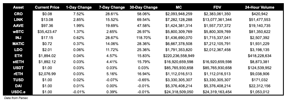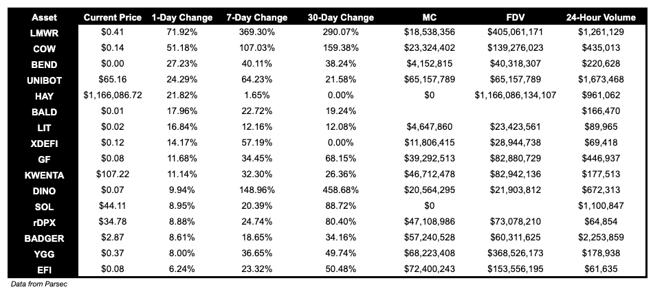 LMWR is up 71.92%. COW is up 51.18% following the core team’s proposal to add fees to test which fee models would be best suited for long-term adoption.