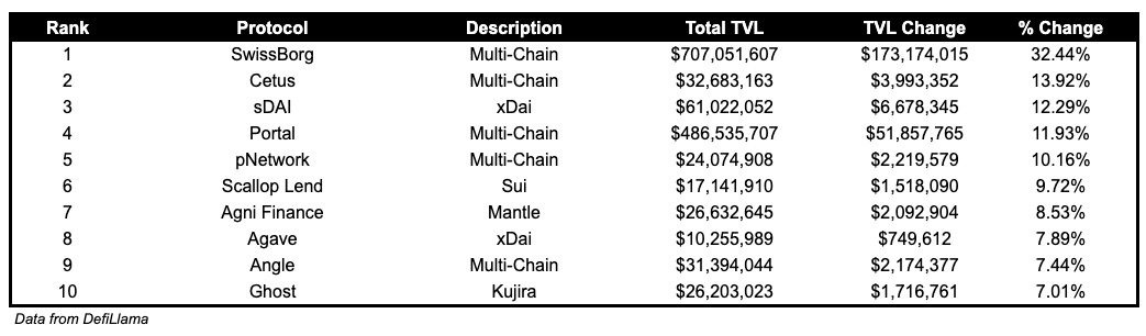 Cetus, DEX on Sui and Aptos, TVL grew by 13.92%.