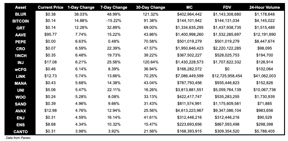 BLUR, up 38.03%, BITCOIN up 14.88% and GRT up 12.28% performed well today.