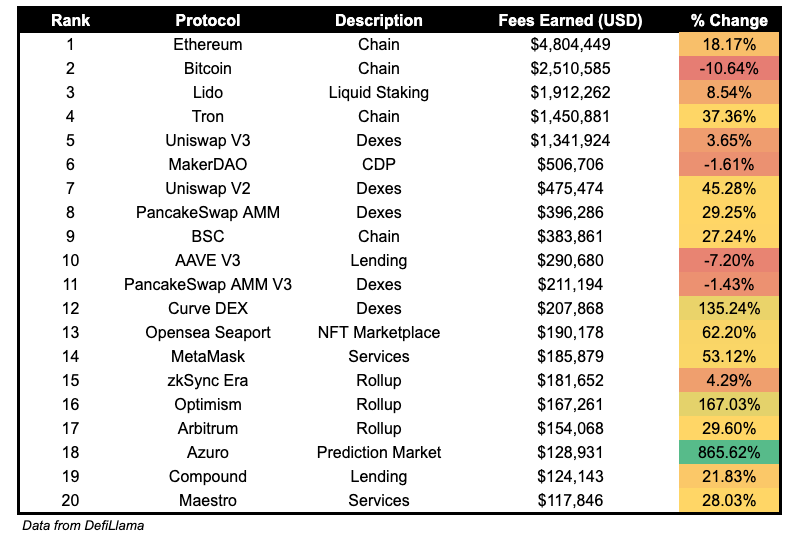 Azuro fees earned grew by 865.62% yesterday.