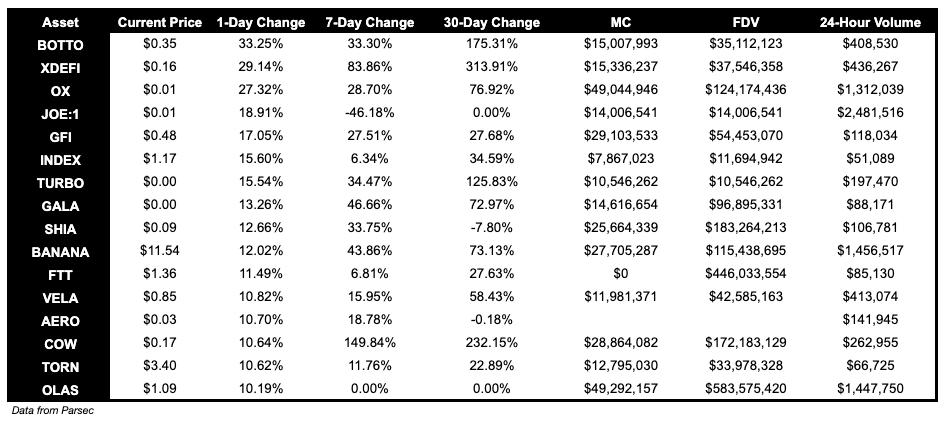 BOTTO, up 33.25%, and OX, up 27.32%, are some notable tokens below $100M MC that performed well over the past day.