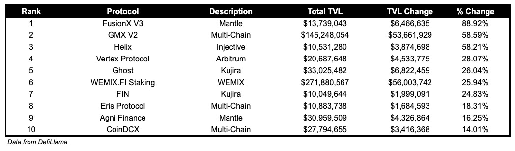 GMX V2, perpetuals DEX on Arbitrum and Avalanche, TVL grew by 58.59%.