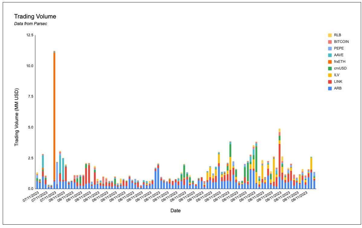 ARB, LINK and PEPE are dominating trading volumes onchain. Some other notable names are crvUSD, RLB and ILV.