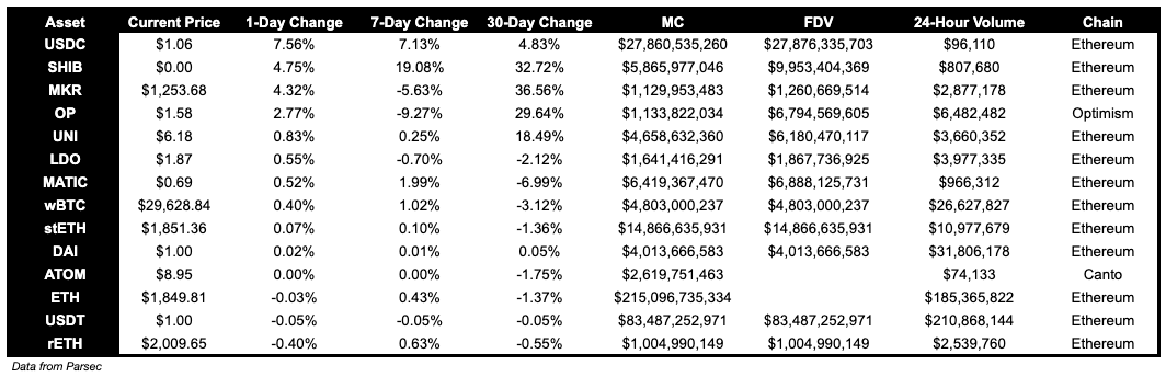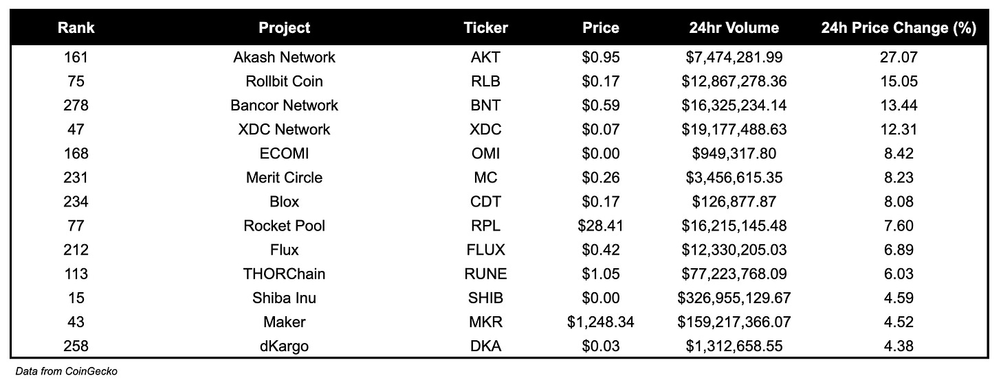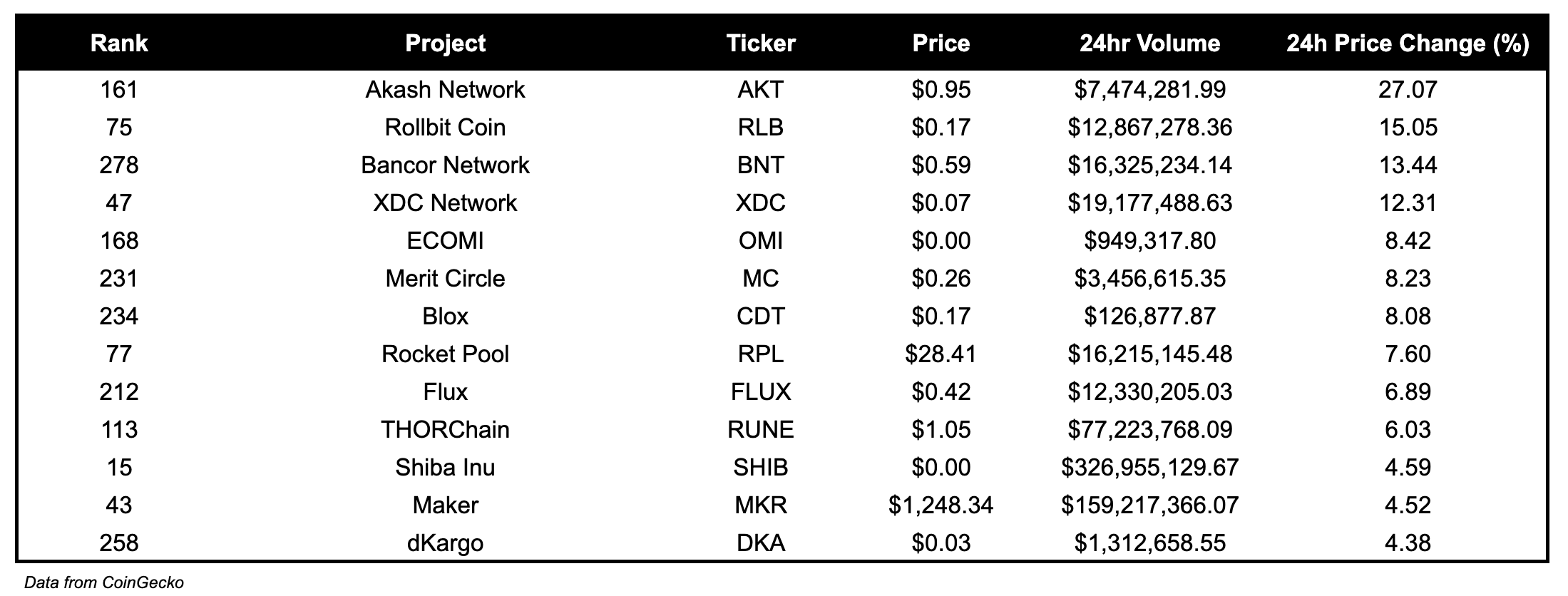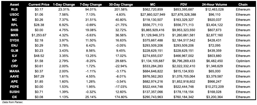 RLB, up 23.31%, and RPL, up 6.92%, are the top performers for coins above $100M MC. Coinbase Ventures made a strategic investment into RPL recently.