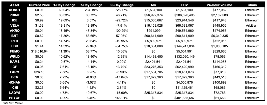ICE, up 19.69%, and VELA, up 19.31%, are top notable performers for coins below $100M MC. Notably, Daniele Sesta made an announcement regarding the mechanics behind WAGMI protocol, which ICE is associated with.