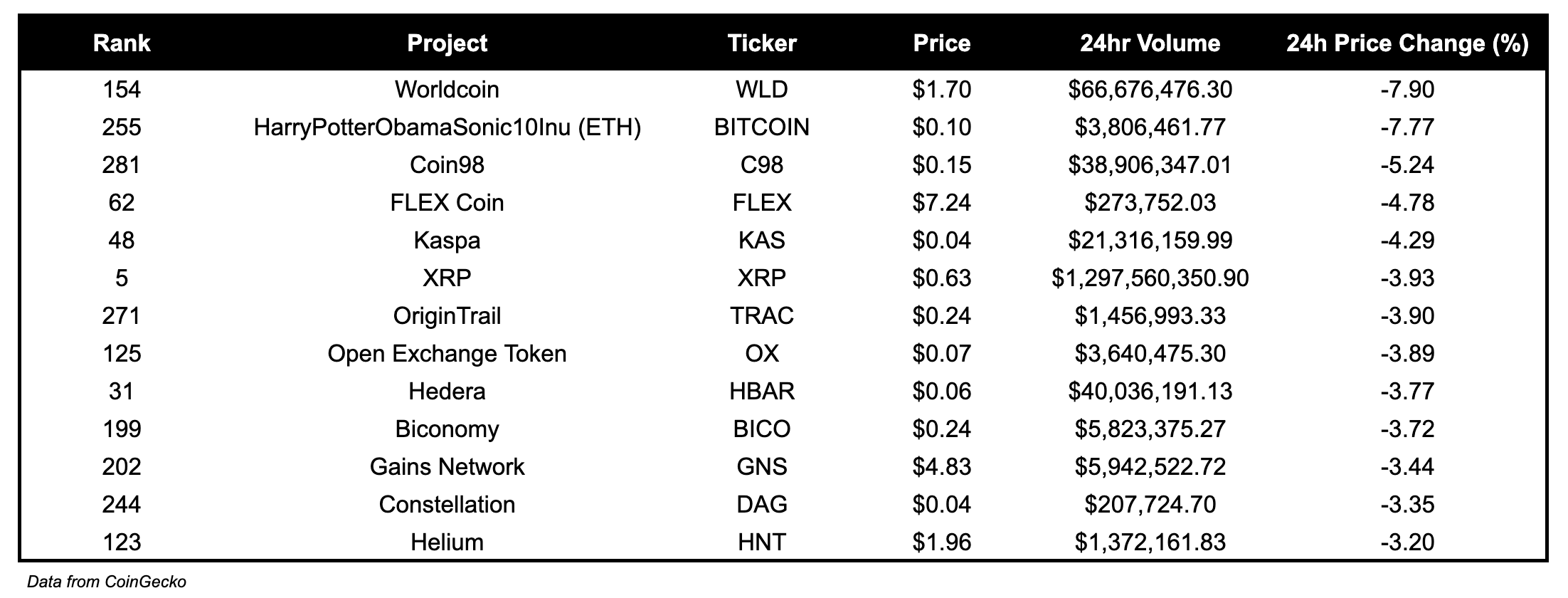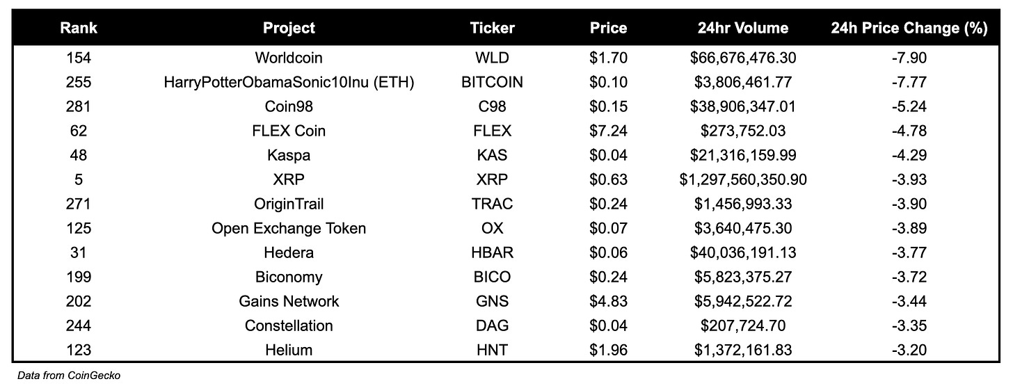 WLD, down 7.90%, and BITCOIN, down 7.77%, are the top underperformers of the day.