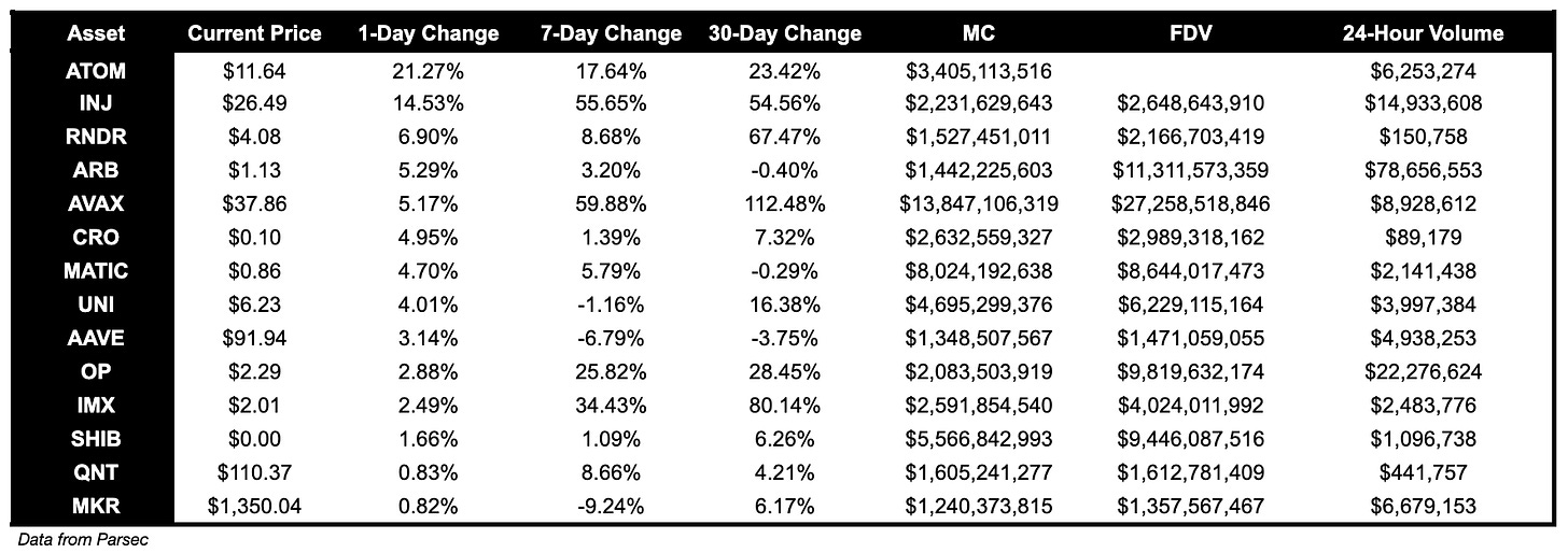 ATOM is up 21.27% over the past day, and INJ is up 14.53%.