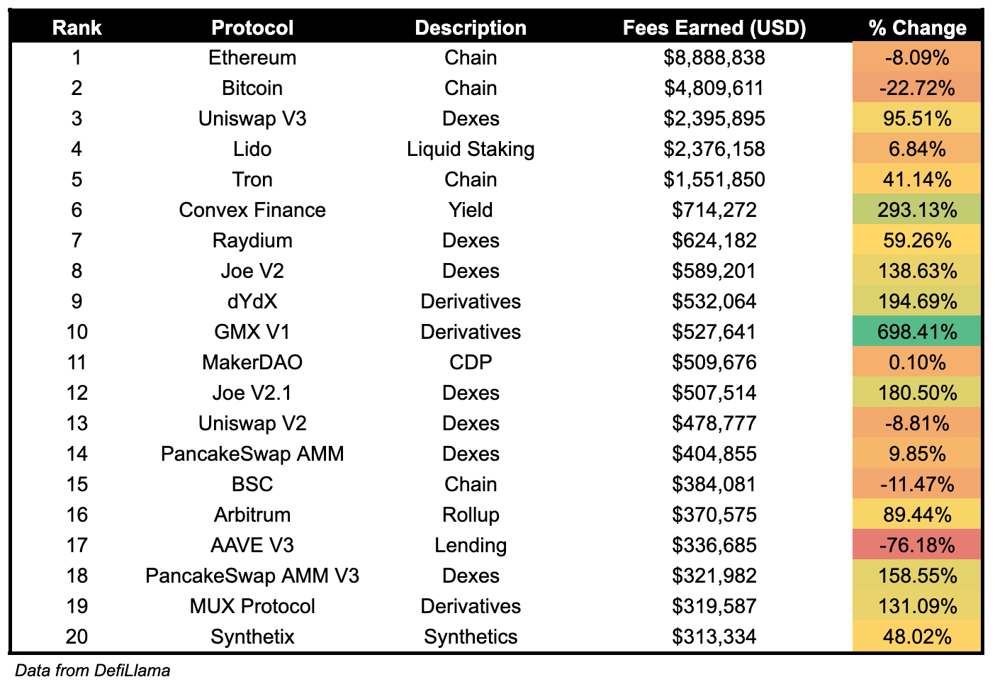 GMX v1 fees increased by 698% to $527,000 over the past day. Convex Finance, saw their fees earned increase 293% to $714,000, and Trader Joe V2 fees earned increased 138.63% over the past day.