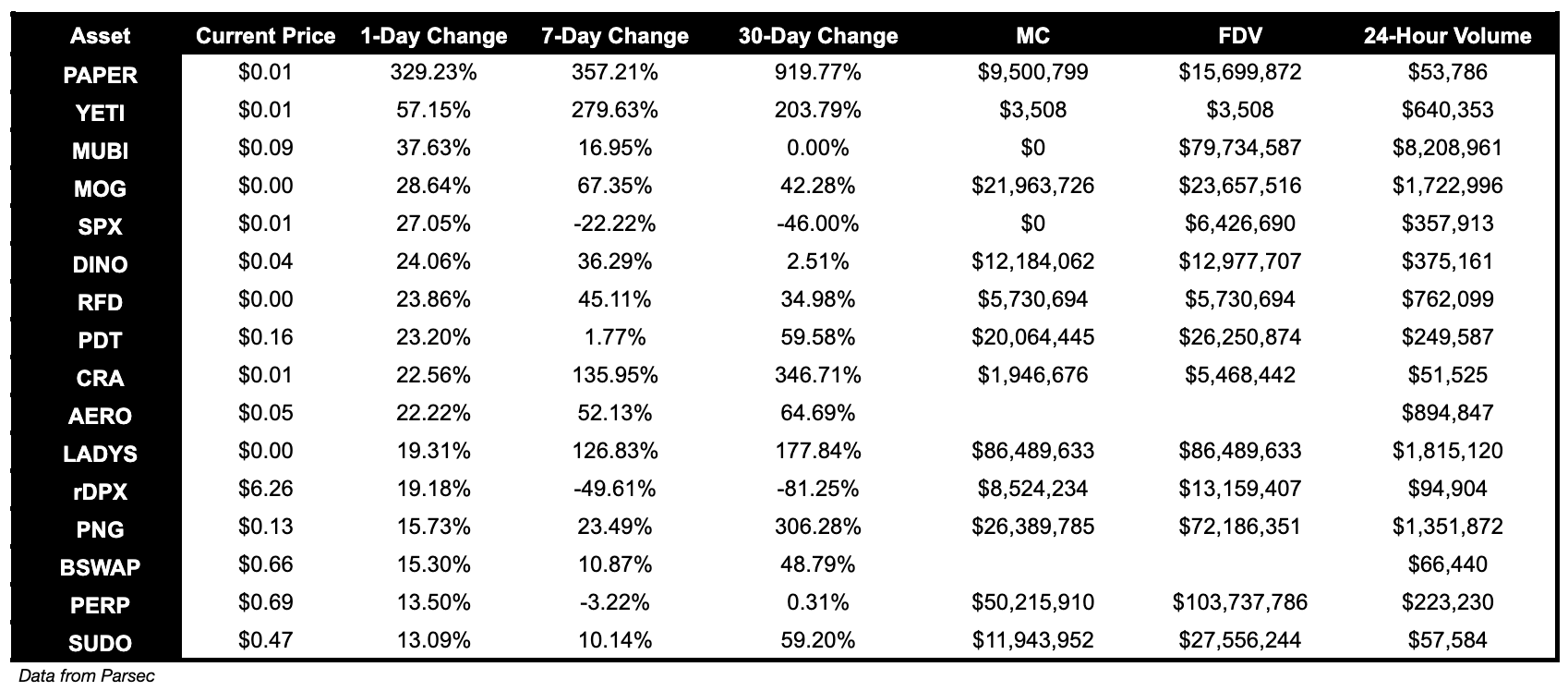 Below $100M MC by performance, on chain