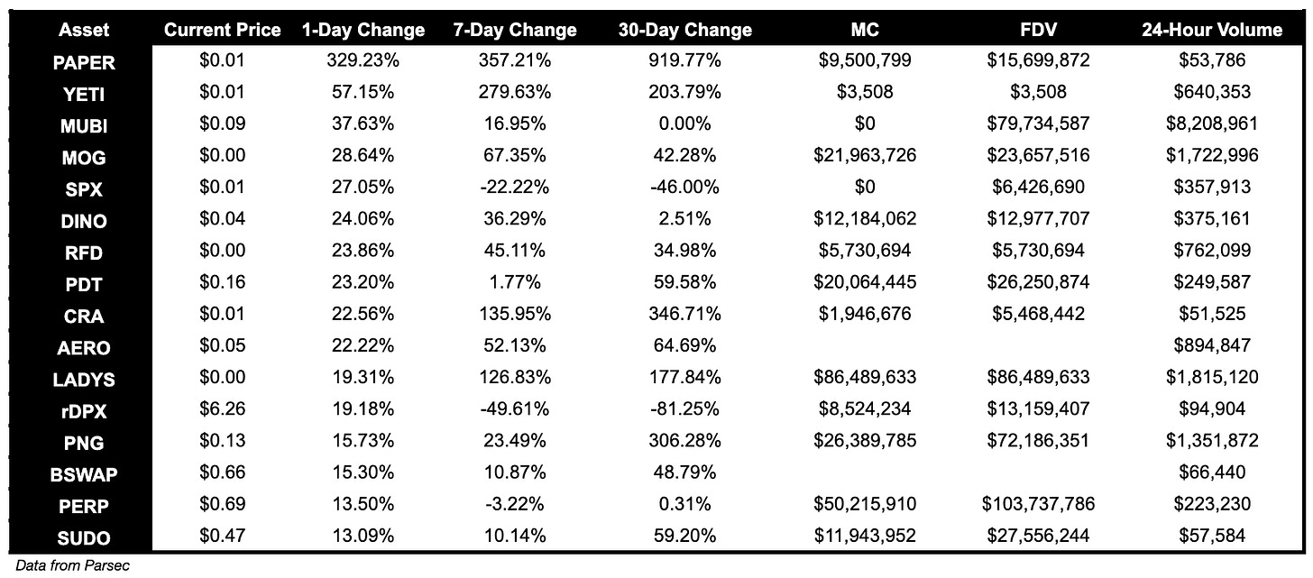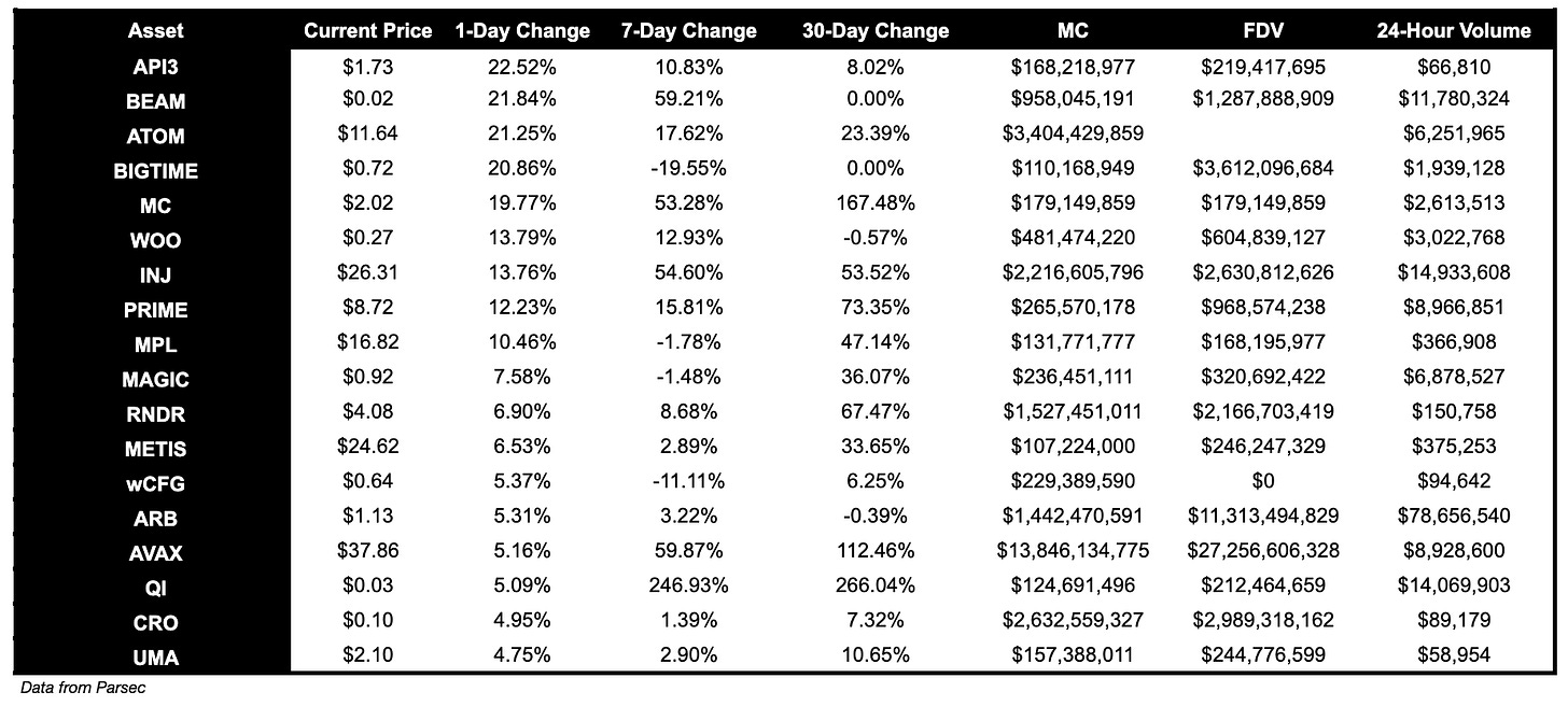 API3 (a web3 focused API provider) is up 22.5%. BEAM increased 21.84% and BIGTIME 20.86%.