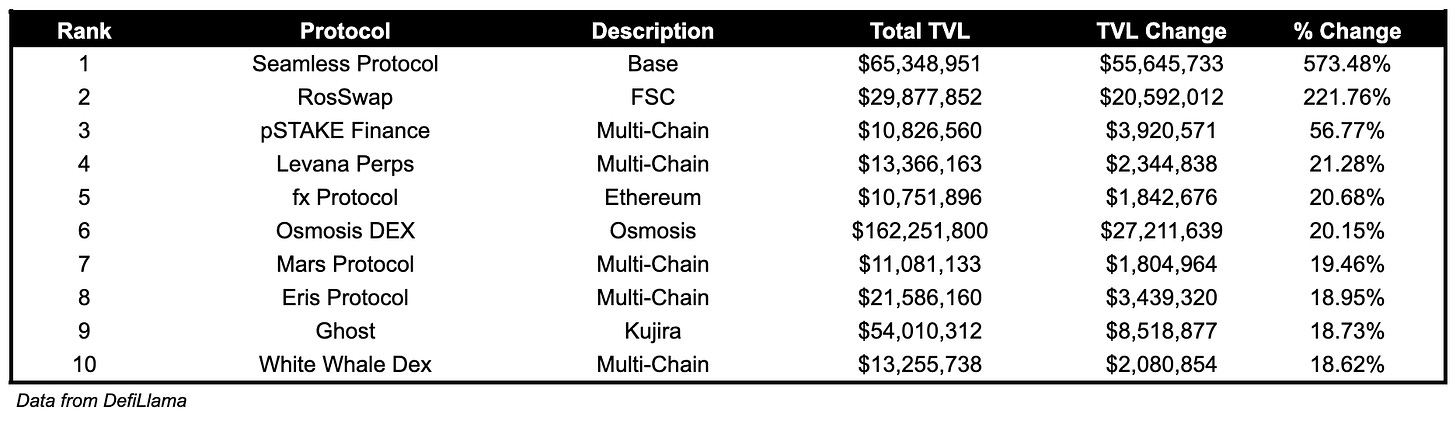 Seamless Protocol, lending and borrowing on Base, TVL grew by 573.48%.