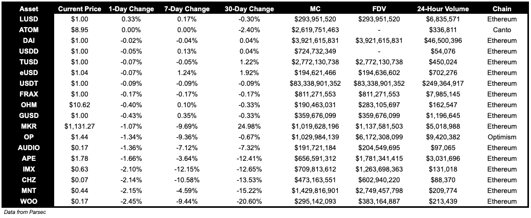 Coins above $100M MC are down today. ATOM, MKR and OP have held up relatively well, compared to the broader market.