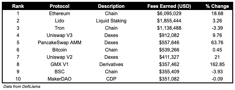 Notably, PancakeSwap fees earned are up 63.76%, at $557.6K, and GMX V1 fees earned are up 162.85%, at $357.5K.