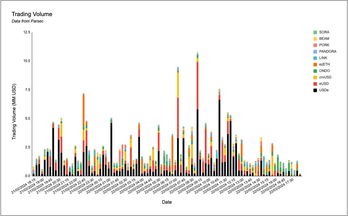 USDe, eUSD, crvUSD, ONDO, and ezETH dominated on-chain volumes.