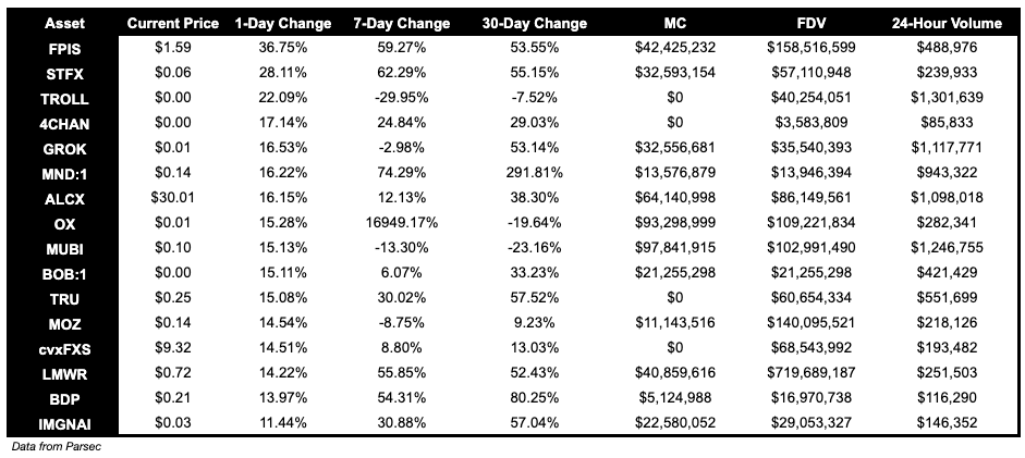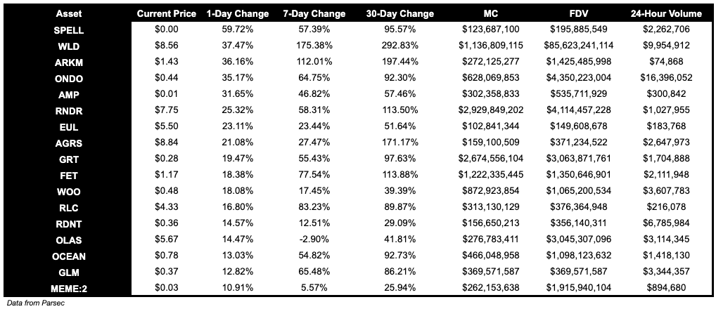 SPELL performed well today, is up nearly 60%. ARKM and WLD, both tokens related to Sam Altman, are up around 37%.