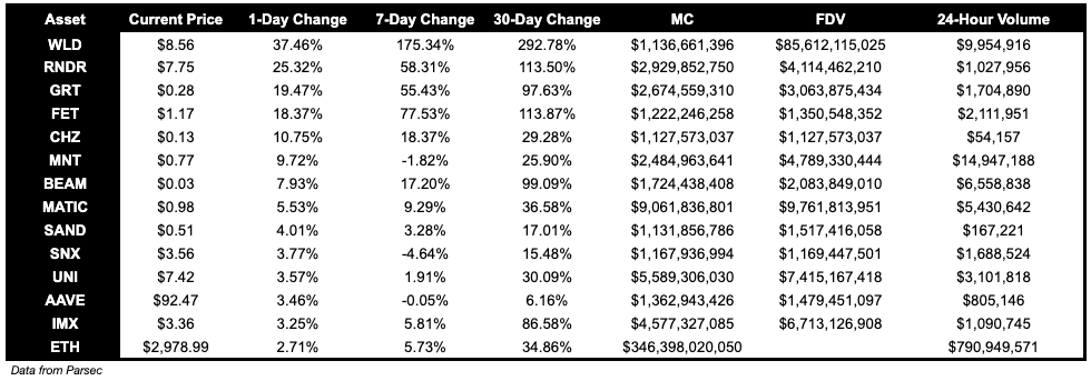 RNDR had a good day, is up 25.32%. FET is up 18.37%.