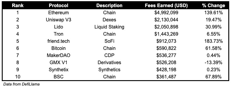 friend.tech fees earned are up 183.73% over the past day. Ethereum fees earned are up 139.61%.