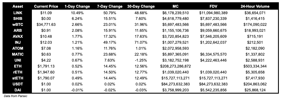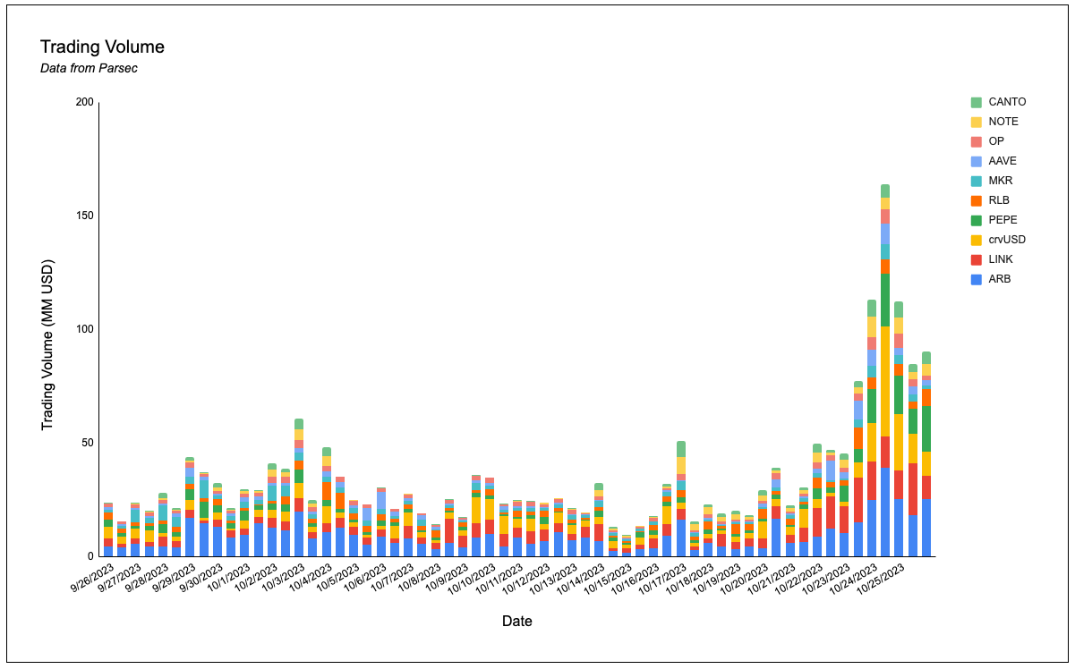 Trading volumes on-chain are still up. ARB, PEPE, RLB and LINK have the highest trading volumes on-chain.