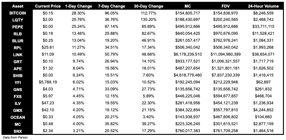 For tokens above $100M MC, Ticker BITCOIN, up 28.30%, LQTY, up 25.76%, and PEPE, up 25.24%, performed well today.