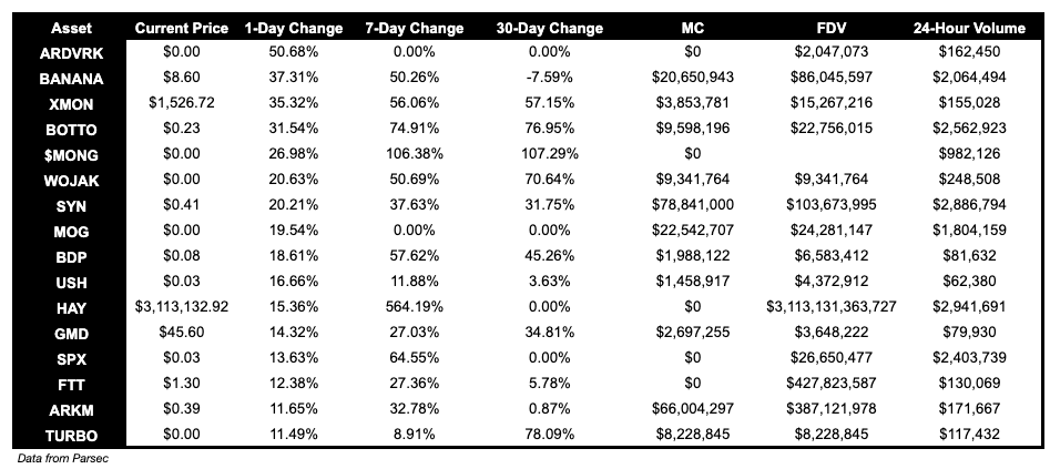 BANANA, up 37.31%, XMON, up 35.32%, and MONG, up 26.98%, performed well today.