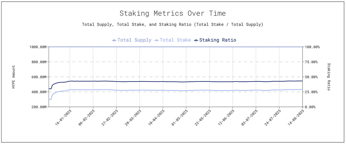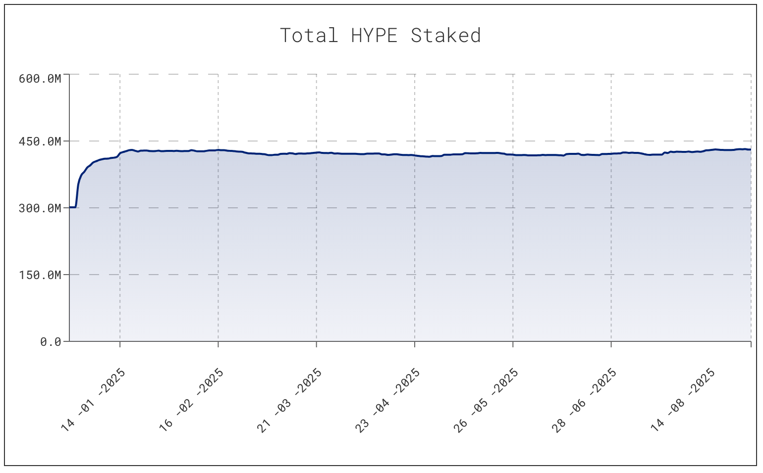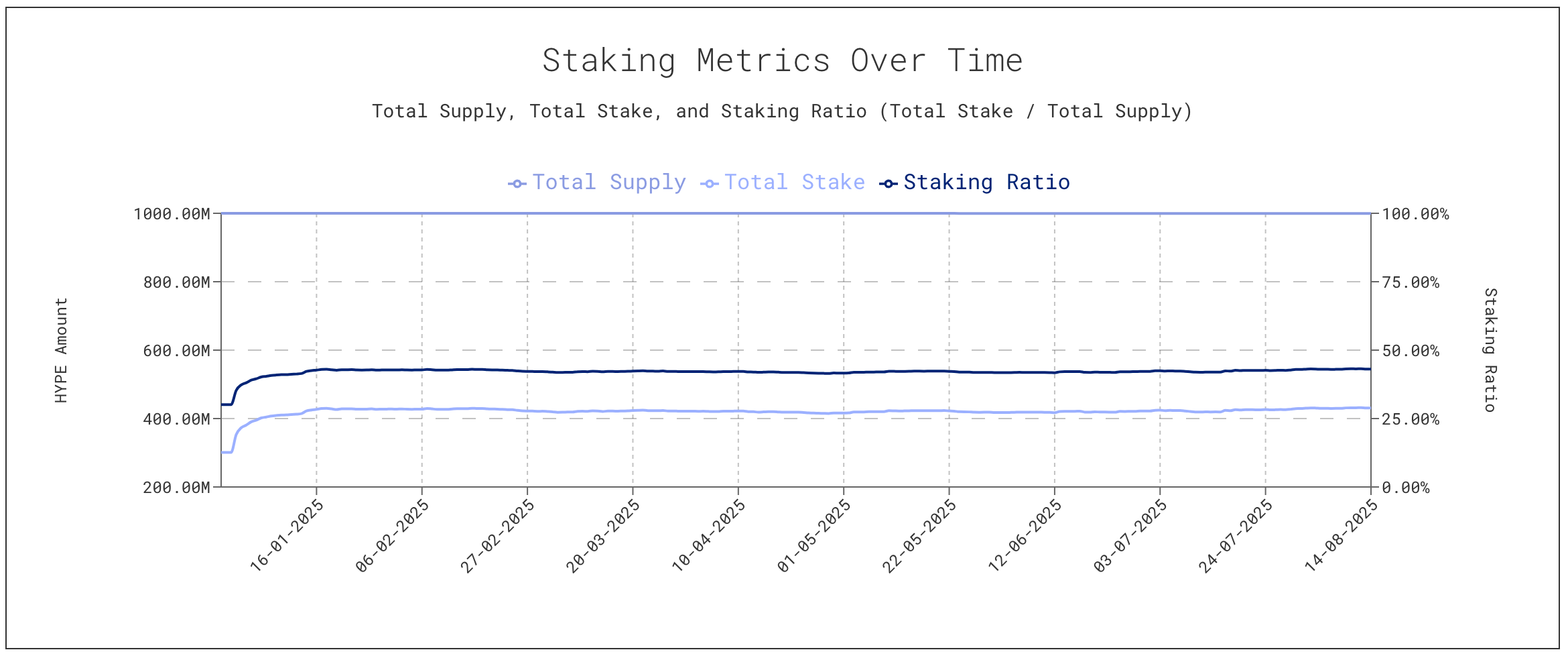 At launch, Hyper Foundation validators had a combined HYPE stake of 300.96M (60.192M HYPE each). Now, there is 430.9M HYPE staked across a permissionless validator set â meaning that 43.10% of the total supply is now staked.
