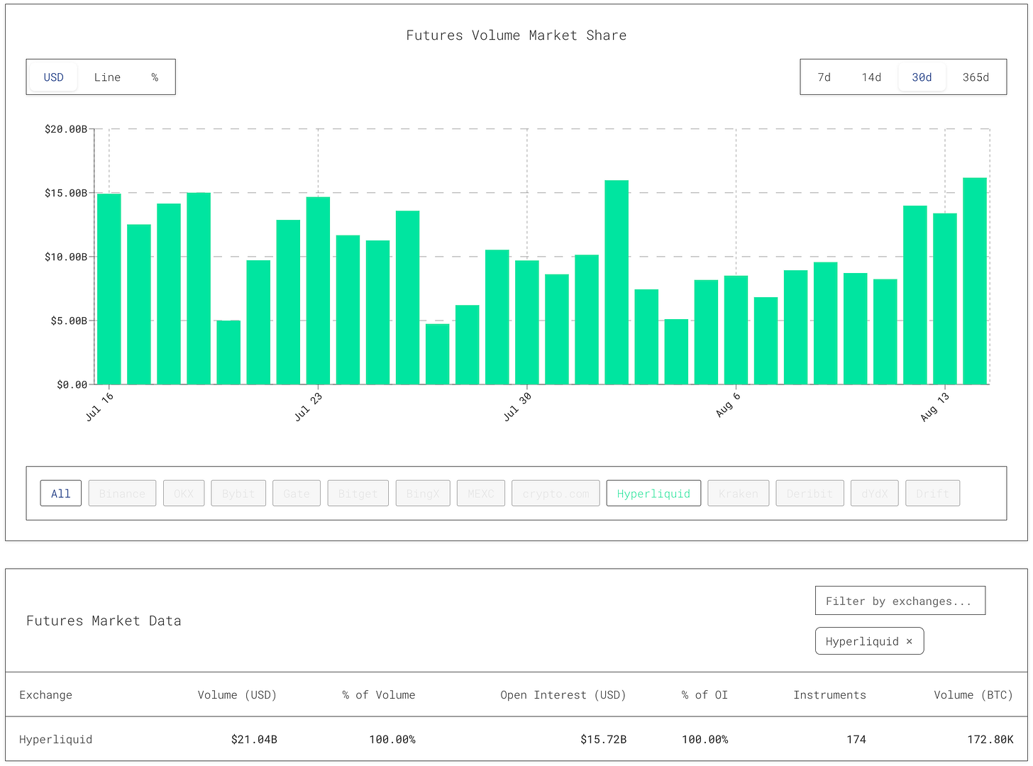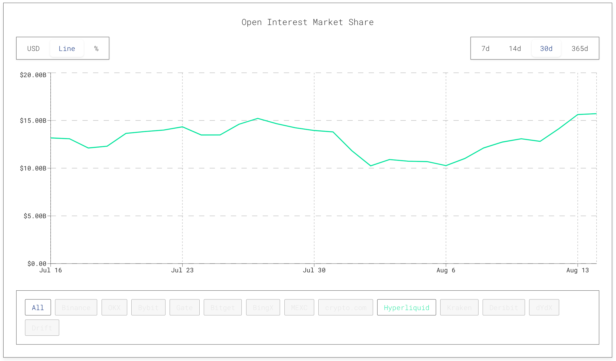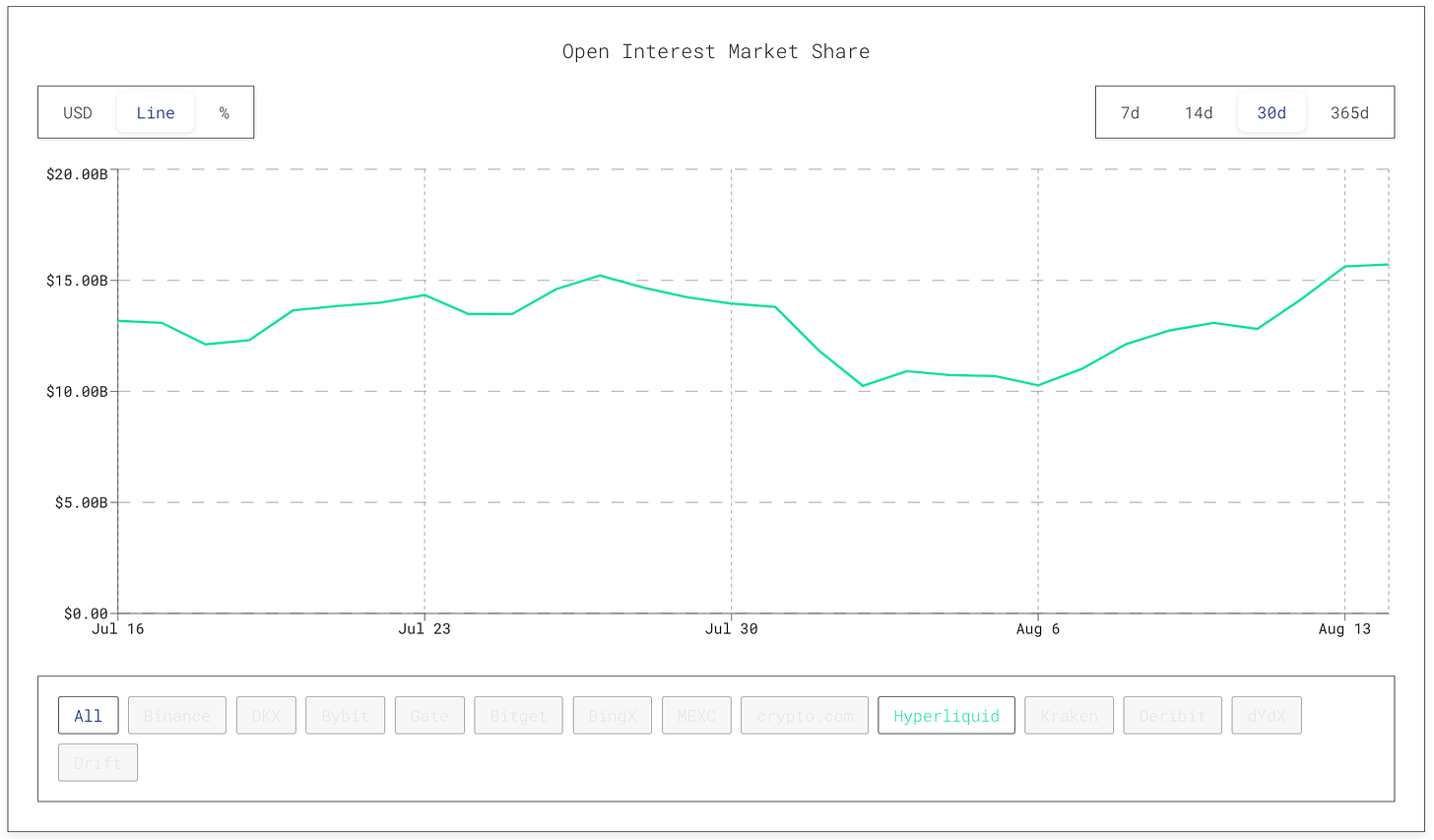 Open interest on Hyperliquid sits at $15.72B as of today. Over the past month, the daily OI average has been $13.01B USD.