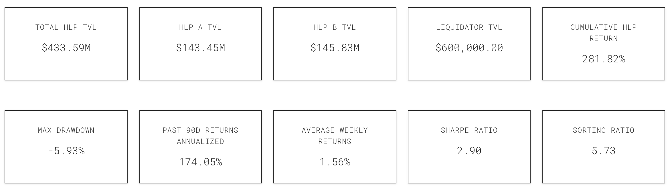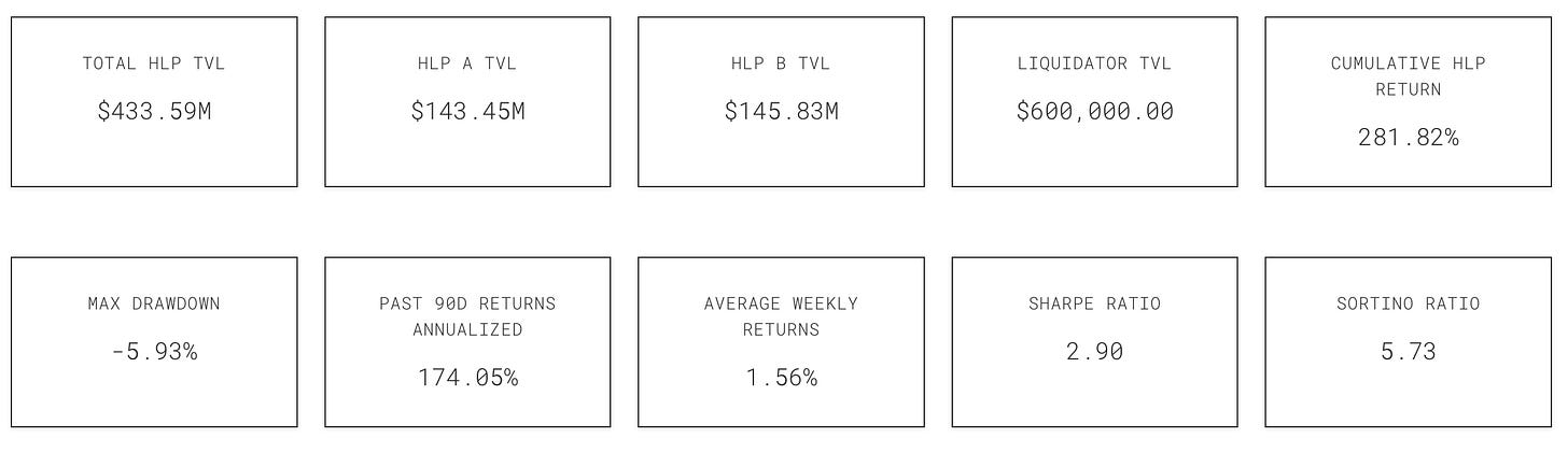 Total HLP TVL sits at $433.6M USD, split across HLP A ($143.45M USD), HLP B ($145.83M USD), and the Liquidator ($600K). The HLP's max drawdown has been 5.93%, and its average weekly return is 1.56%. Cumulative PnL is now $72.8M (281.82% return), putting the HLP's Sharpe ratio at 2.9.