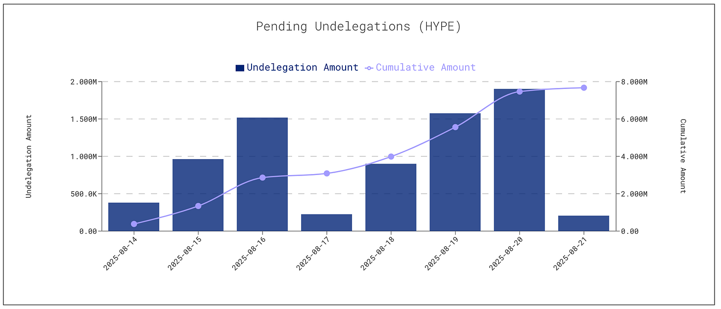 A cumulative 7.673M HYPE ($360.25M USD) will be unstaked over the next week. The largest daily unstaking will occur on August 20th, with 1.903M HYPE ($32.26M USD) being unstaked.