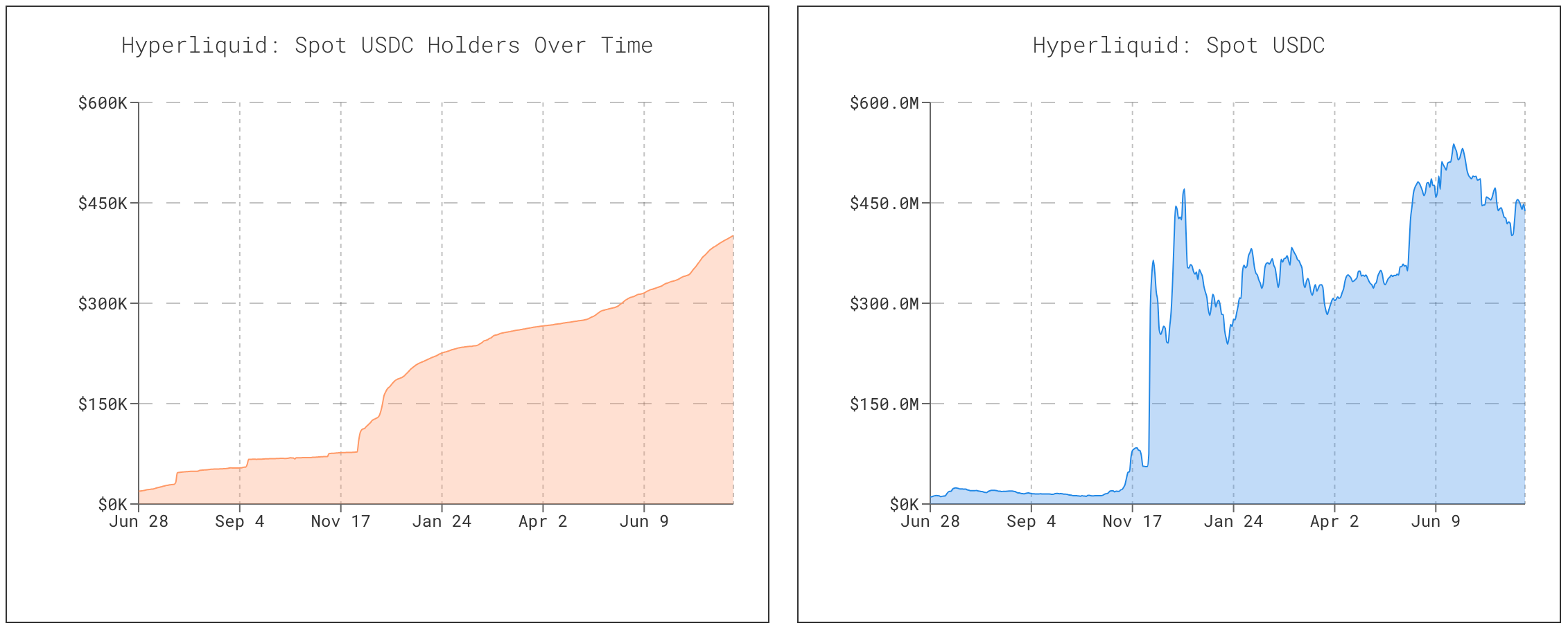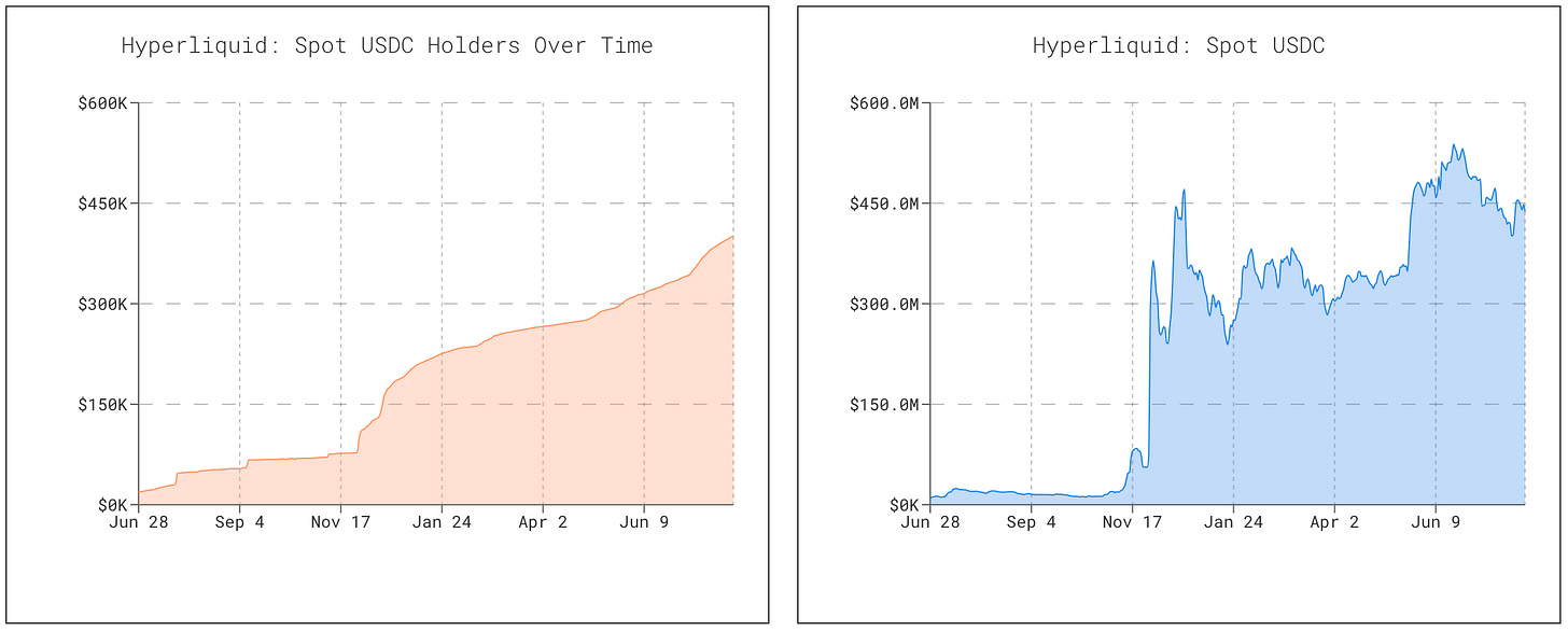Spot USDC available on the HyperCore sits at just above $455M USD, while spot USDC holders are steadily increasing and have crossed 400K.
