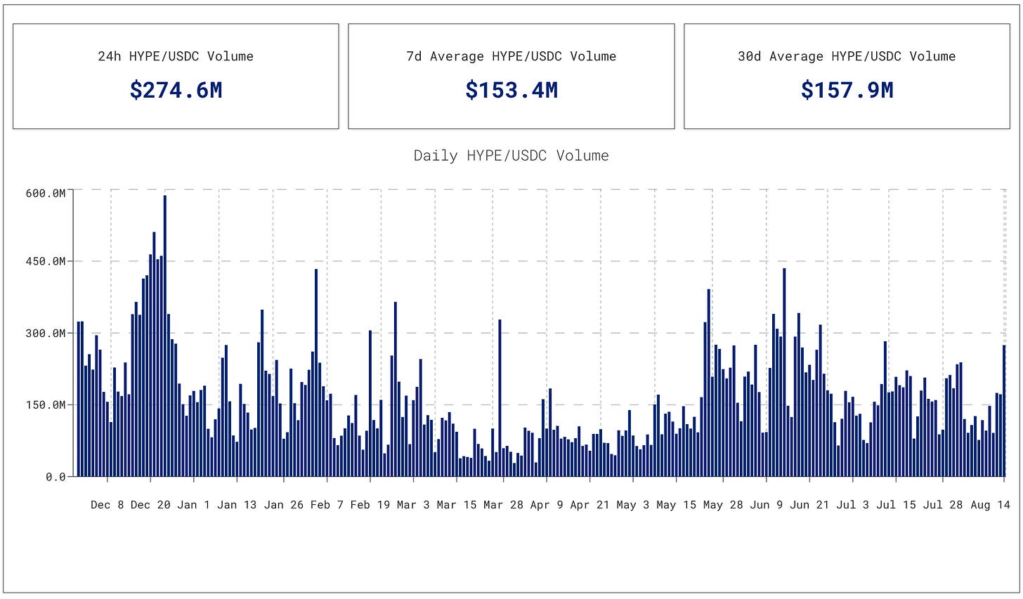 24H HYPE/USDC volumes are $274.6M USD, higher than the past 7D ($153.4M USD) and past 30D ($157.9M USD) averages.