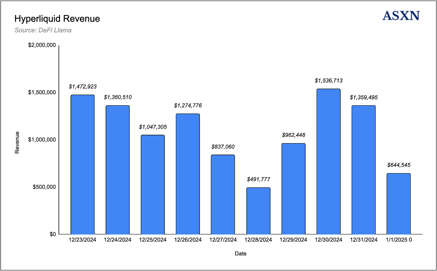 Since DeFiLlama began tracking Hyperliquid's revenue, the platform has averaged $1,149,223 in daily revenue, even during the typically slower holiday season. This performance translates to an impressive $419.7 million in annualized revenue.