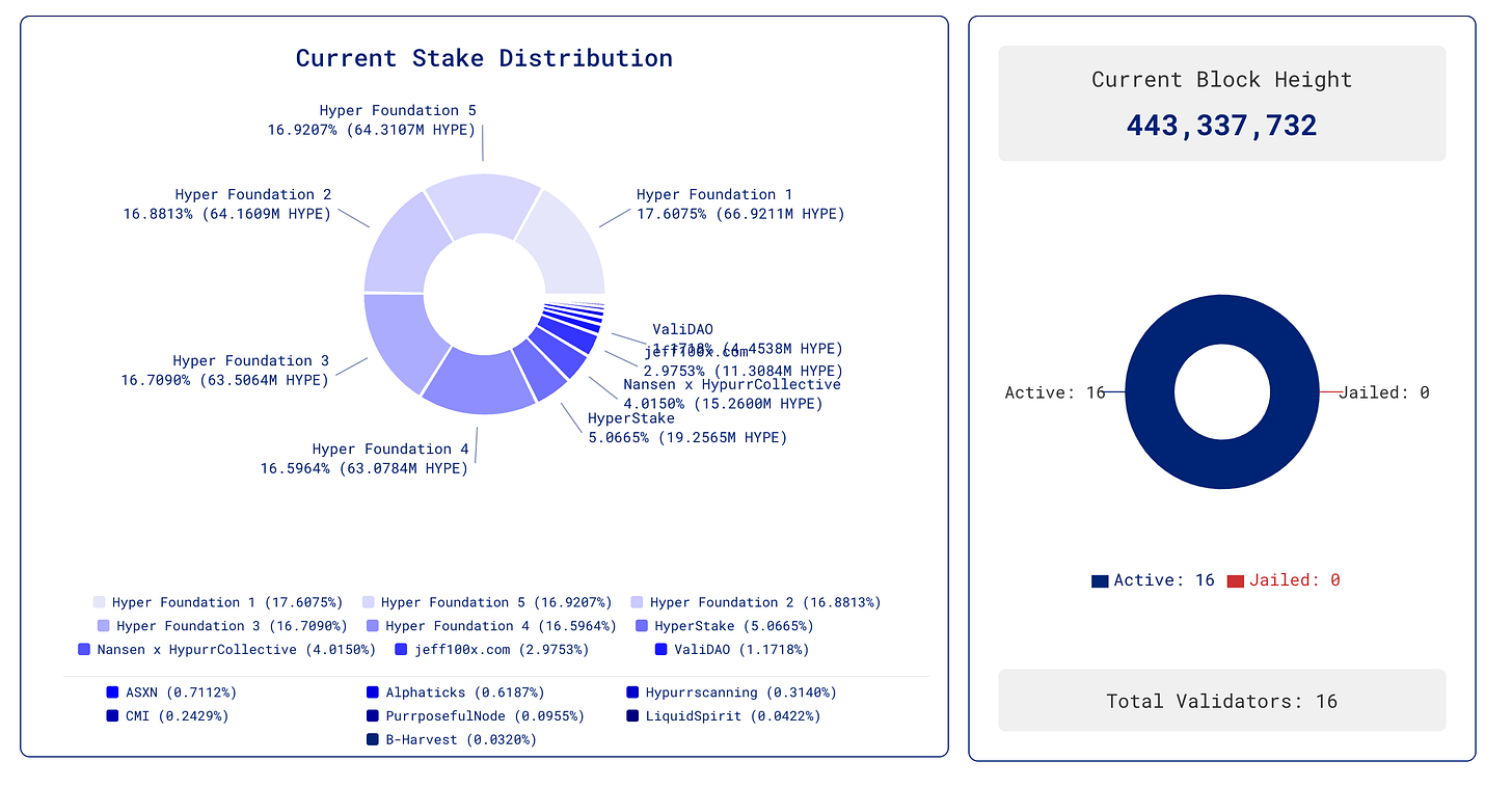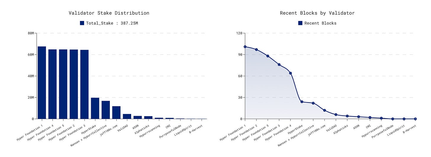 A significant portion of the current stake remains concentrated with the Hyper Foundation validators. However, since the mainnet launch, this concentration has improved, with the Foundation validators now holding 83.98% of the total stake.