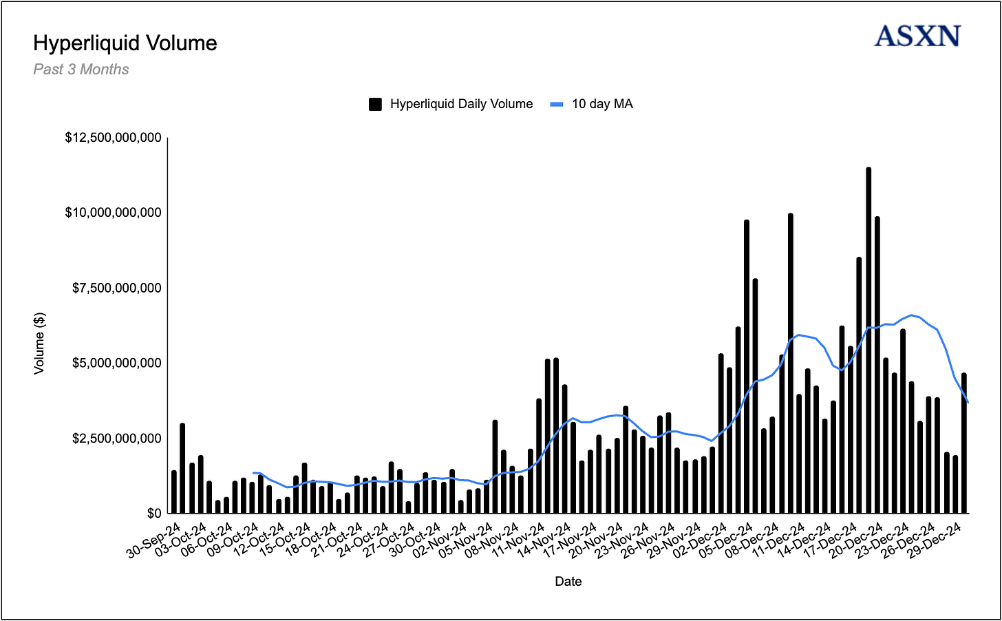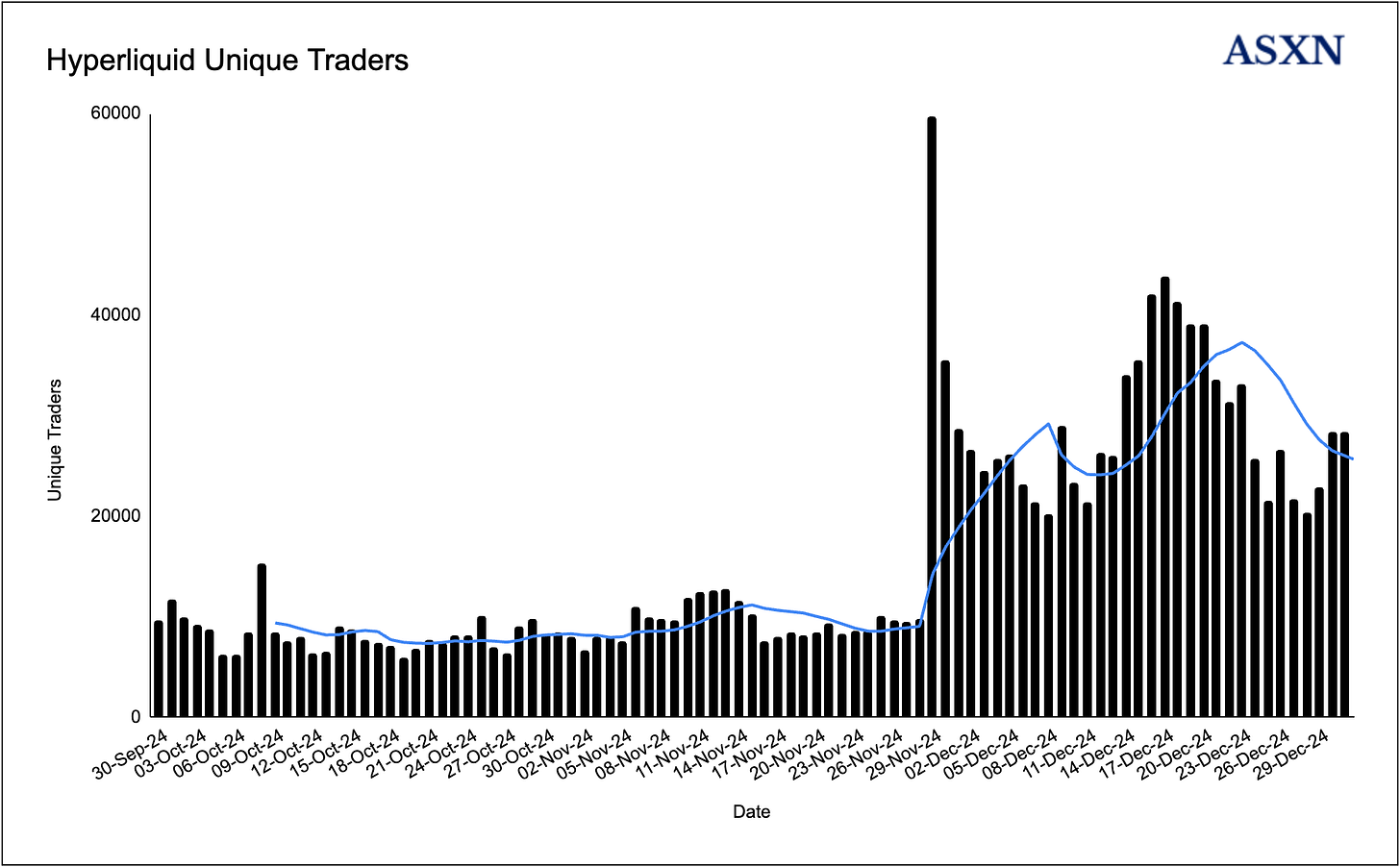 Daily unique traders continue to average above 20,000, briefly peaking at 60,000 unique traders the day of HYPE TGE.